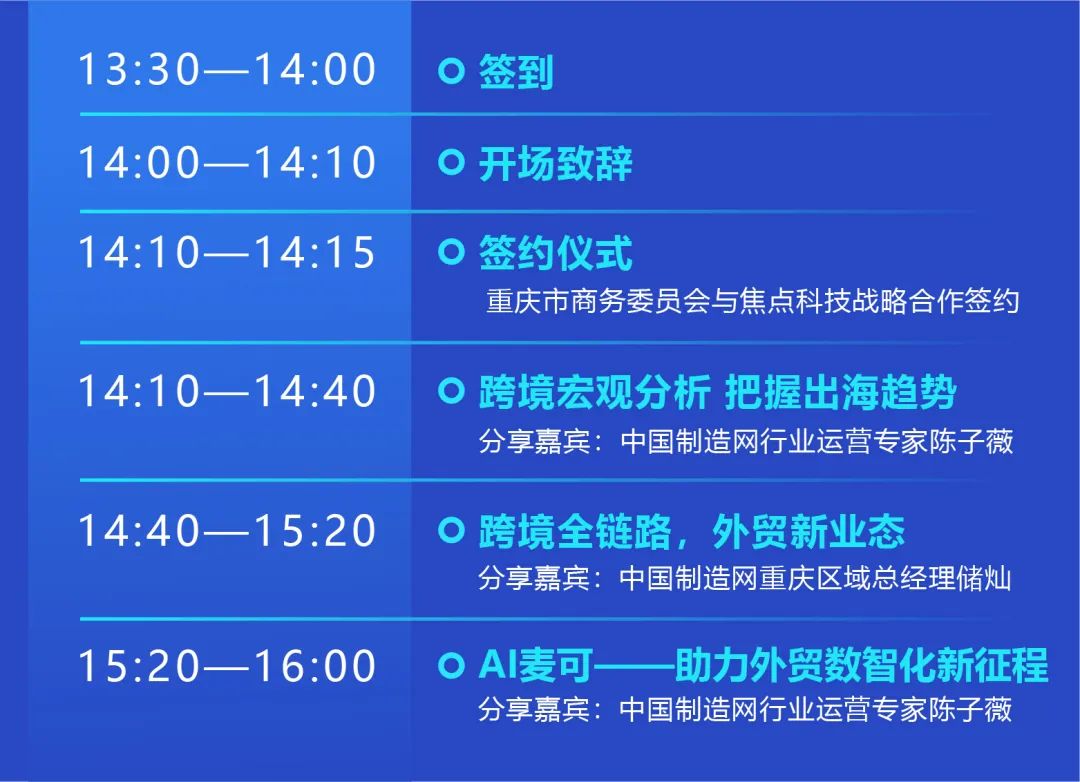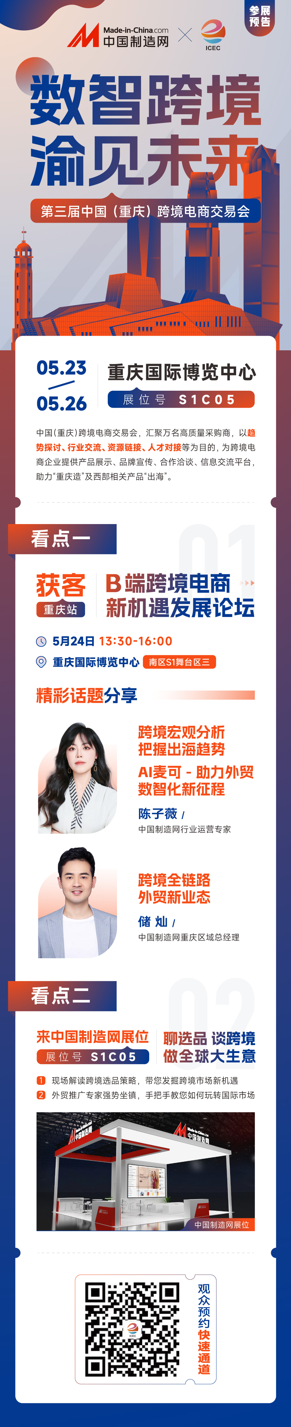 作为全链路外贸服务综合平台,中国制造网致力于为中国供应商和海外采购商挖掘全球商机,为双方国际贸易的达成,提供一站式外贸服务。5月24日下午,中国制造网将借助自身在跨境电商领域的丰富经验和资源优势,在第三届中国(重庆)跨境电商交易会上举办获客—B端跨境电商新机遇发展论坛,帮助企业更好地应对市场变化,把握跨境电商的新机遇。01活动亮点/02活动议程 / 现诚挚邀请全球采买商家莅临本次论坛,共同探讨B端跨境电商的新机遇和发展趋势,期待与您相见!