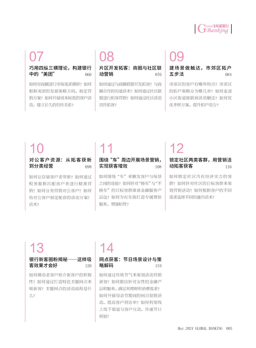 2024年5月刊,邀约了十几位名师共同探讨如何通过低成本来拓新客。其中包含了多场景获客、商户商圈拓客、线上线下互通拓客、片区开发拓客、市郊区获客、对公获客、营销活动拓客、节日场景拓客等多角度的获客之法。通过落地的方案、具体的流程、实用的案例、有效的话术阐述了拓新客的策略与技巧,从而助力银行赢得更多客户与资金。