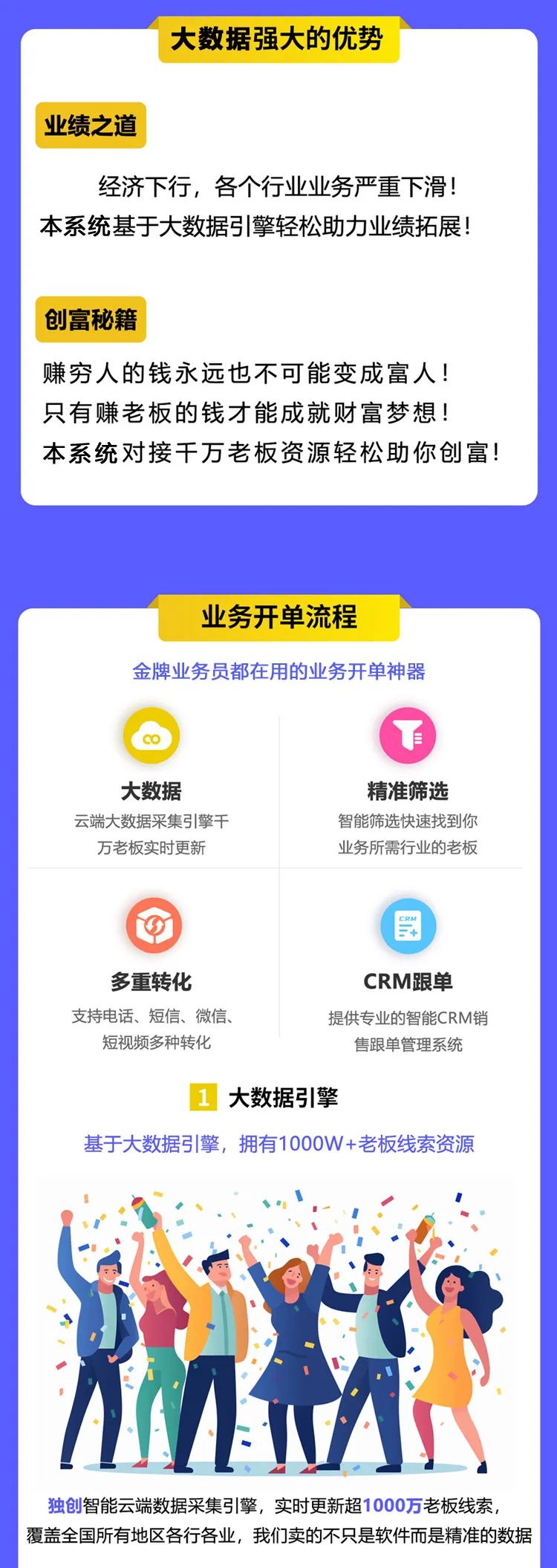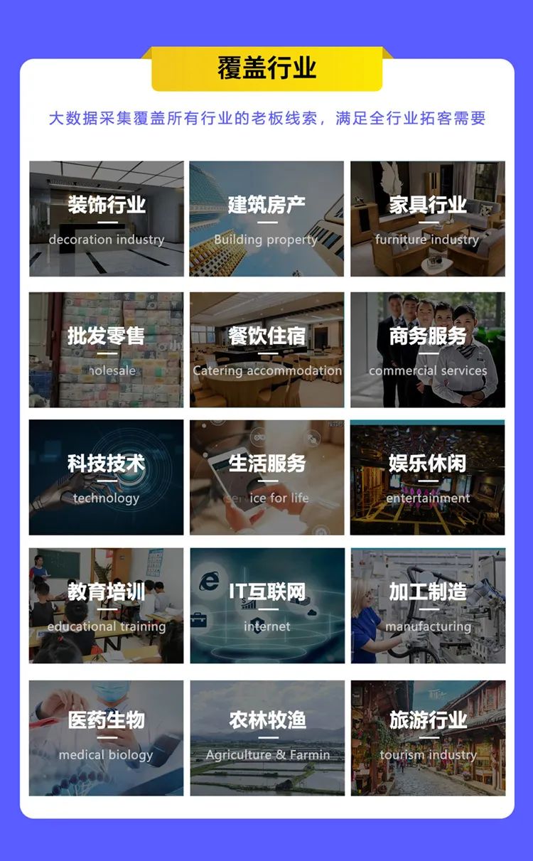 由专业的大数据团队对全网多个平台进行数据采集并经过大数据分析将精准有效的数据进行汇总,目前已收录超过1000W+的全国各行业老板精准信息,并通过云端接口为系统提供数据支撑。