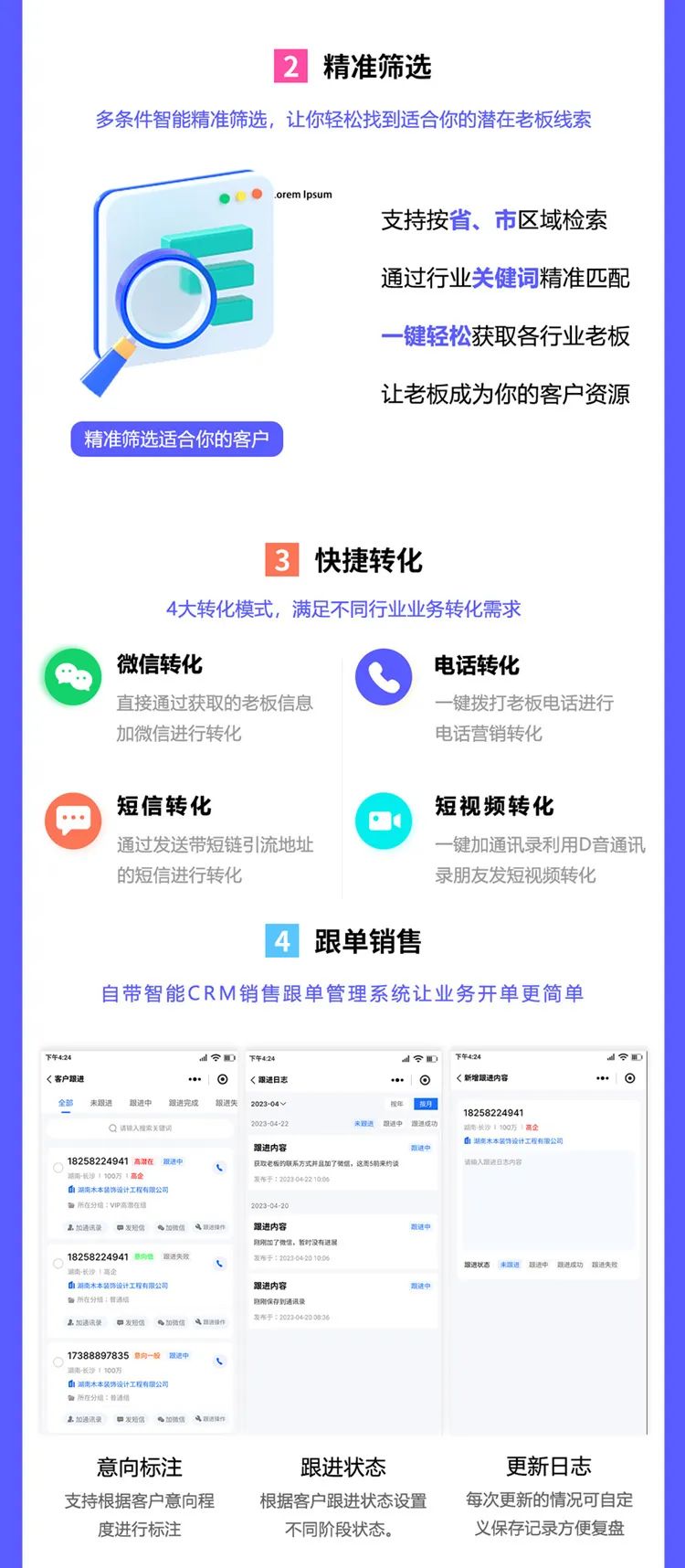 所有筛选的数据都是各行业老板信息,直接联系能做决策拍板的老板业务成功率自然就高很多。程序提供了短信、电话、微信、通讯录+短视频四重转化模式,让老板快速变成你的客户。