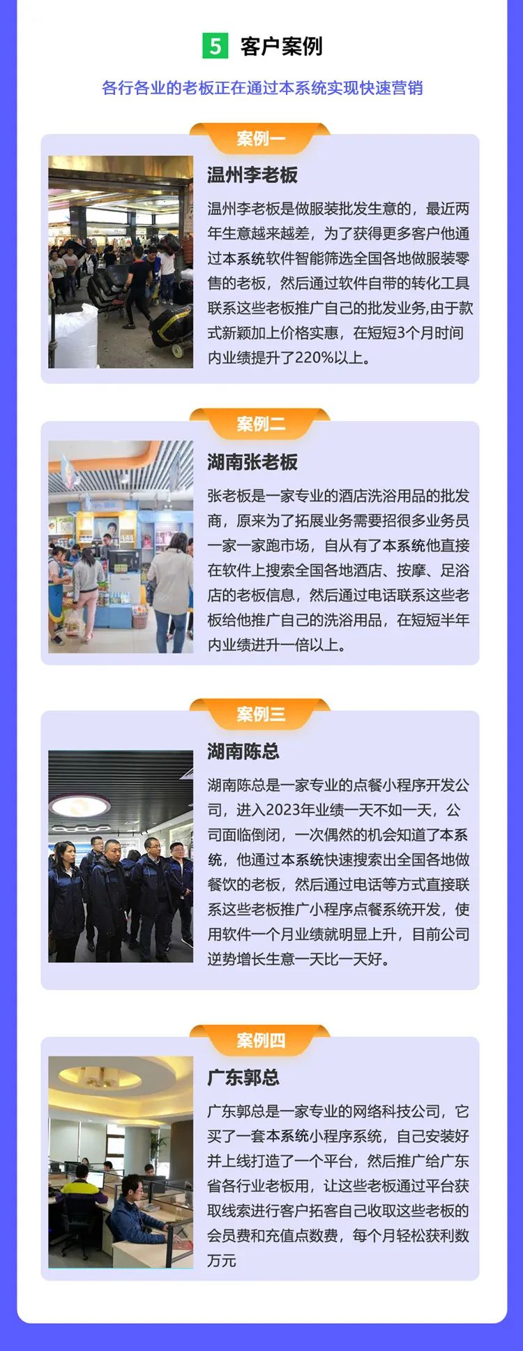 总之:本系统汇集了全国各行业的老板联系信息,不管你从事什么产品销售,都可以快速帮你找到有相关需求的行业老板,通过找到的海量老板信息结合加微信、发短信、电话联系进行跟进转化,快速提升业务拓展能力,让天下没有难做的生意。