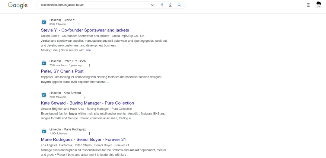 而擅长主动开发的外贸人,在社交媒体上,除了日常更帖外。还会积极增加自己的好友数或粉丝数。比如每天添加一些LinkedIn的精准客户,每天在Instagram上与目标客户互动一下等等,这其中就会涉及到一些方法了。比如在linkedin上,当你还没有太多的好友时,你想要在上面搜客户,几乎是举步维艰。但是,聪明的外贸人就会钻Linkedin的空子,从Google绕进去。在google上搜索:site:linkedin.com/in jacket buyer,找到Linkedin上做Jacket的买手,点击进入其个人主页上添加好友。甚至配合一些google插件,挖掘更多联系方式进行沟通。