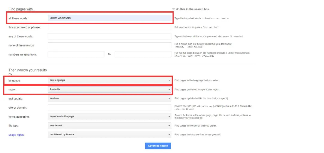 A.利用Google Advanced Search,设置搜索条件,我常筛选的条件为国家和语言。效果还是比较直接的,对于想要开发特定国家的客户,能快速搜出一批高质量的客户网站。