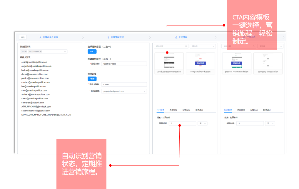 Ai营销旅程,它可以自动识别不同的营销状态,进行二次、三次、四次的自动化内容推送。如果你不知道内容怎么写,外贸GPT一键帮你进行Ai内容创作,轻松营销,不在话下。
