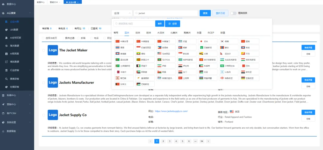 用户可以通过关键词、企业名称、网站、邮箱、电话等,轻松找到买家资源。外贸企业再也不用东一下西一下地去搜索客户,在Ai精准联系人板块,已经结合了各个渠道的大数据资源,帮你把买家的信息捋得明明白白。要资料有资料,要邮箱有邮箱,要决策人有决策人,要采购信息有采购信息……