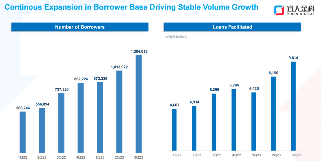 在最近几家美股上市互金企业财报中,我们都看到平台获客已步入存量博弈阶段。新增新客户越来越难,在此背景下,助贷同业互相导流也已经成为行业常态。比如,宜人金科就在最新的2023年3季度财报中披露了通过多元化消费场景获得优质借款客户,这些场景包括四大类:(2)金融服务场景:oppo、微博钱包、小米金融、还呗、新浪分期众所周知,还呗、小米金融、信用飞、微博钱包等平台与宜享花一样,主打助贷业务。下面看看,在新增客户越来越难的背景下,宜人金科的借款业务成绩:截至2023年9月30日,宜人金科未偿贷款余额151亿元,同比增长42.45%;截至2023年9月30日,宜人金科累计借款人达到859.58万人,同比提升23.5%;2023年第三季度服务的借款人人数为120.4万人,同比增长63.3%,去年同期为73.73万人;2023年第三季度促成的贷款总额达到98亿元,同比增长56%,比2023年第二季度的82亿元增长了20.3%,虽然各方面数据不如其他美股上市互金平台,但与自身相比,本季度确实有极大的提升。从下面的数据图也可以看出:收益电话会还提到:与上一季度相比,三季度机构融资成本减少了约5%;此外,本季度宜享花APP月活用户比上一季度增长23%,达到294万。每个用户的平均交易数量保持稳定在3倍,用户粘性和活跃度很高。电话会议提到宜享花用户分布:大约30%是首次借款人,其余70%是重复借款人。宜人金科还在持续探索新的获客渠道,并优化获客方法,以吸引高质量的新客户。宜人金科的业务分三个板块,上述借款相关的业务,宜人金科官方叫「财务咨询」板块,剩下还有「保险经纪」板块、「品质生活」板块。2023年第三季度的总承保保费为14.29亿元,与2022年同期的9.969亿元相比增长43.29%,比2023年第一季度的1.325亿元增长了7.2%。增加的主要原因是长期保单续期保费的贡献。截至2023年9月30日,累计服务的保险客户数量达到125.68万人,同比增44.98%;2023年第三季度服务的保险客户数量为12.37万人,同比减少20.86%,2022年同期为15.63万人,比2023年第一季度的13.54万人下降了8.7%。关于下降原因,宜人金科解释因为战略转向优先考虑平均保费较高的产品。本季度生产的GMV总额比上一季度增长42%,达到5.63亿元。本季度活跃用户总数也比上一季度增长了22%,达到296万。累计会员权益人数655万。宜人金科表示,品质生活业务的增长与金融服务业务创造了协同效应,活跃用户进一步刺激了贷款需求的增加,使得生态系统中相互加强循环。本季度开始使用人工智能辅助营销工具来提高广告定位准确性,并实现更大的社交媒体知名度。同时也在升级聊天机器人,辅助贷款初期阶段的服务。本季度宜人金科还结合使用人工智能辅助营销工具,为新借款人提供便利贷款。宜人金科也在扩张国际业务,其中菲律宾市场有了显著增长。第三季度业绩比上一季度相比,增长了172%。后续会继续追求国际市场的增长。虽然有三个板块业务,但主要贡献收入的还是借款相关的「财务咨询」板块:第三季度,宜人金科总收入为13.11亿元,同比增长55.9%;归母净利润为5.54亿元,同比增长105.1%。营收构成:财务咨询占51%;保险经纪占20%;品质生活占29%。「宜人金科」前身为「宜人贷」,是宜信旗下的金融科技公司,2015年12月18日登陆纽交所,CEO唐宁。宜信一度被称为中国P2P鼻祖。2023年3季度财报,在本公众号后台回复关键字「宜人金科」可获得。本号后续会持续更新有价值的行业信息,感兴趣的持续关注。