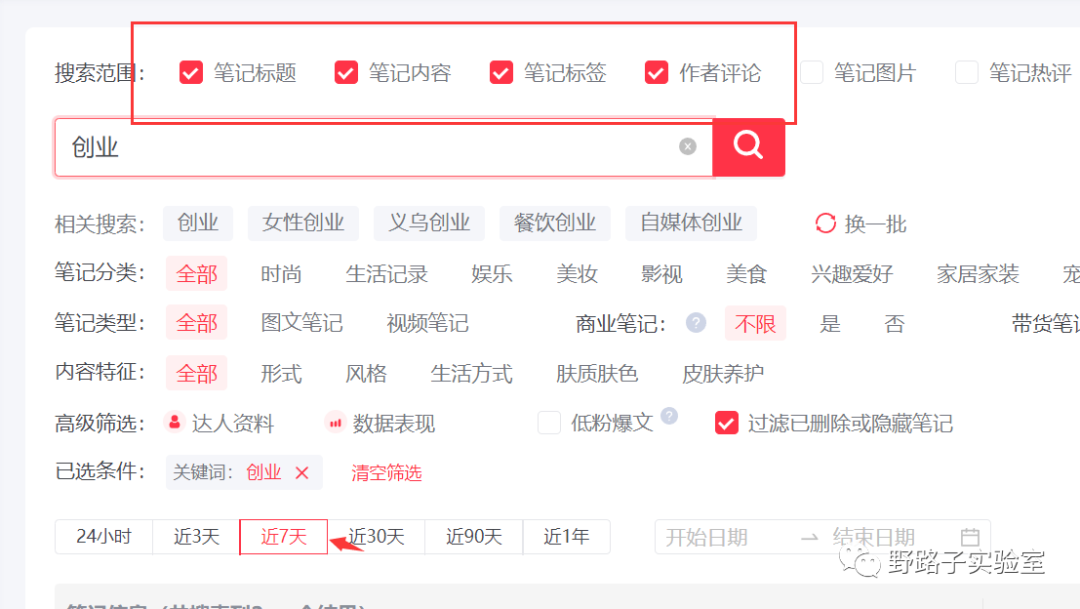 我拿灰豚举例,用笔记搜索关键词,例如"创业"关键词,可以筛选搜索精准的关键词范围,然后选择近期时间,24小时或者3天内的笔记