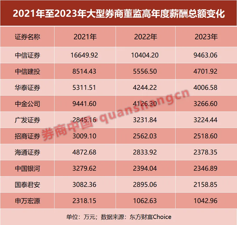 中信证券董监高降薪规模为2023年行业之最,年度薪酬总额继2022年减少6246万元后再减少941.14万元。2023年当期中信证券董监高薪酬总额合计9463万元,排在行业首位。