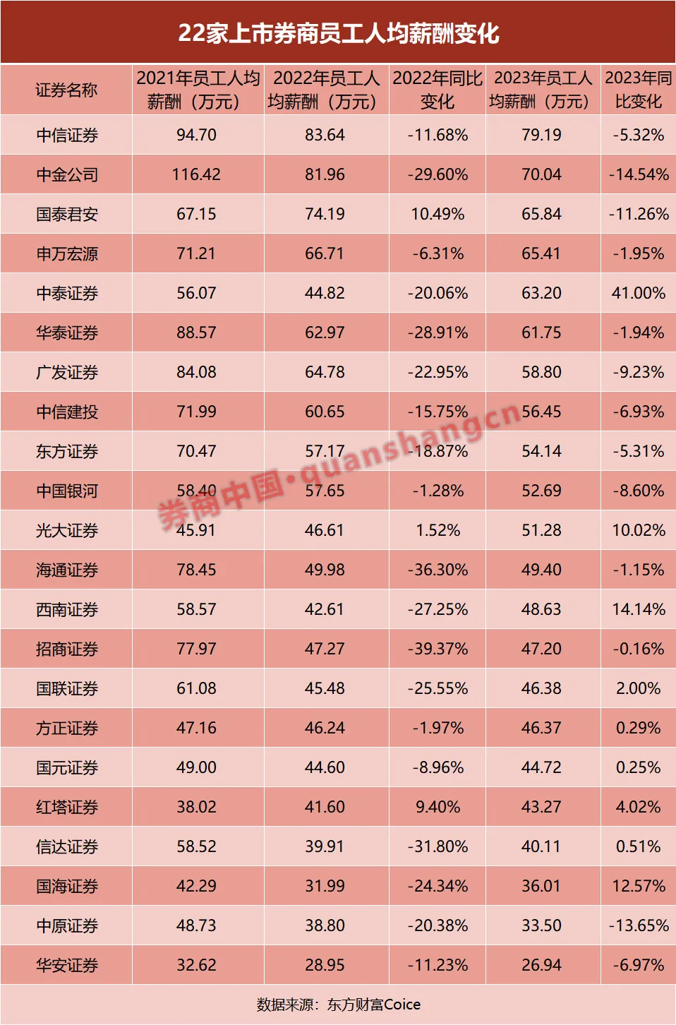 其中,有12家券商的员工人均薪酬已出现连续两年下滑。不过,整体而言,相比较2022年多家券商出现降薪20%的幅度,2023年22家券商员工人均薪酬下滑幅度平均不到10%