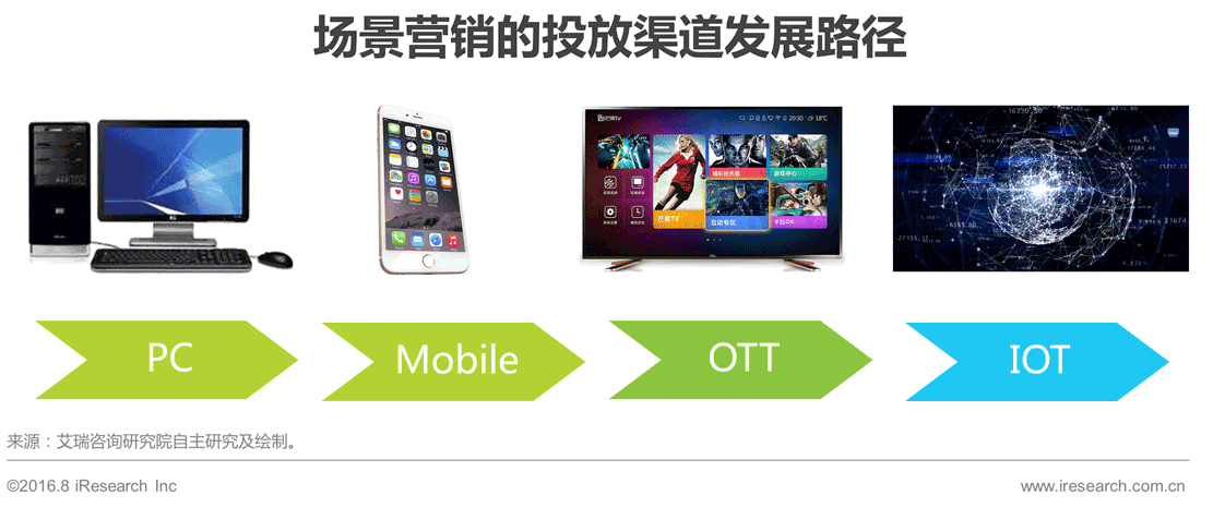 从网络营销来看,场景营销更多的是优化作用,1)对PC营销而言,部分PC营销伴随着IP地址库的完善和跨屏技术的发展也将具有场景特色;2)对移动营销而言,未来大部分移动营销都将是场景营销;3)对未来的OTT营销而言,场景营销将是OTT营销的催化剂。