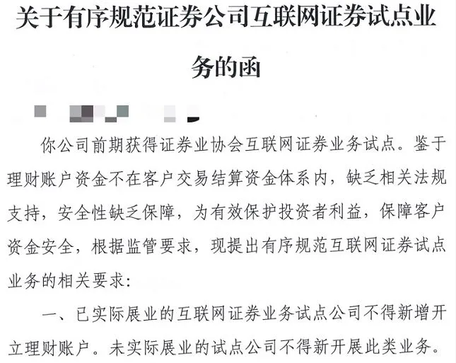 今日,中国证券业协会向部分券商下发《关于有序规范证券公司互联网证券试点业务的函》,该函指出,鉴于理财账户资金不在客户交易结算资金体系内,缺乏相关法规支持,安全性缺乏保障,为有效保护投资者利益,保障客户资金安全,根据监管要求,现提出有序规范互联网证券试点业务的相关要求: