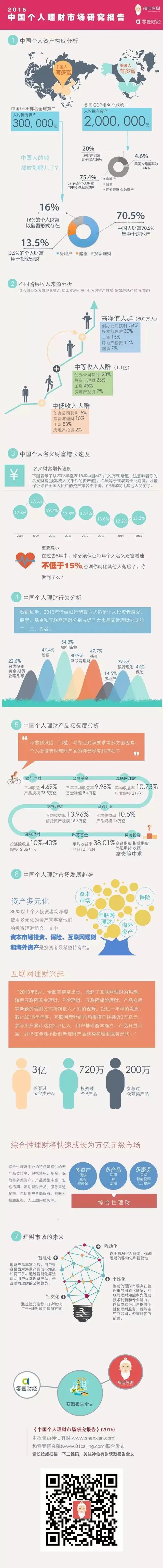 3月29日,零壹研究院联合神仙有财发布了《中国个人理财市场研究报告》。报告显示,2015年我国个人理财市场基本规模在40万亿-50万亿之间,理财人规模约在4-5亿,理财人人均理财规模约在10万元左右。报告认为,综合性理财由于多资产、多产品、多服务的特点将快速成长为万亿元级市场。