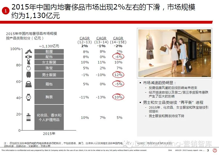 趋势一:2015年,中国奢侈品市场出现2%左右的下滑,市场规模降至约1,130亿元,腕表、男士服装和箱包类别销量下跌是引发这一趋势的主要原因;华北和东北地区受影响最为严重;