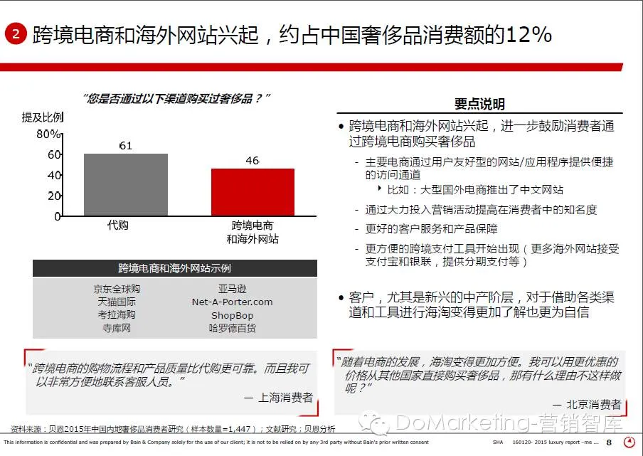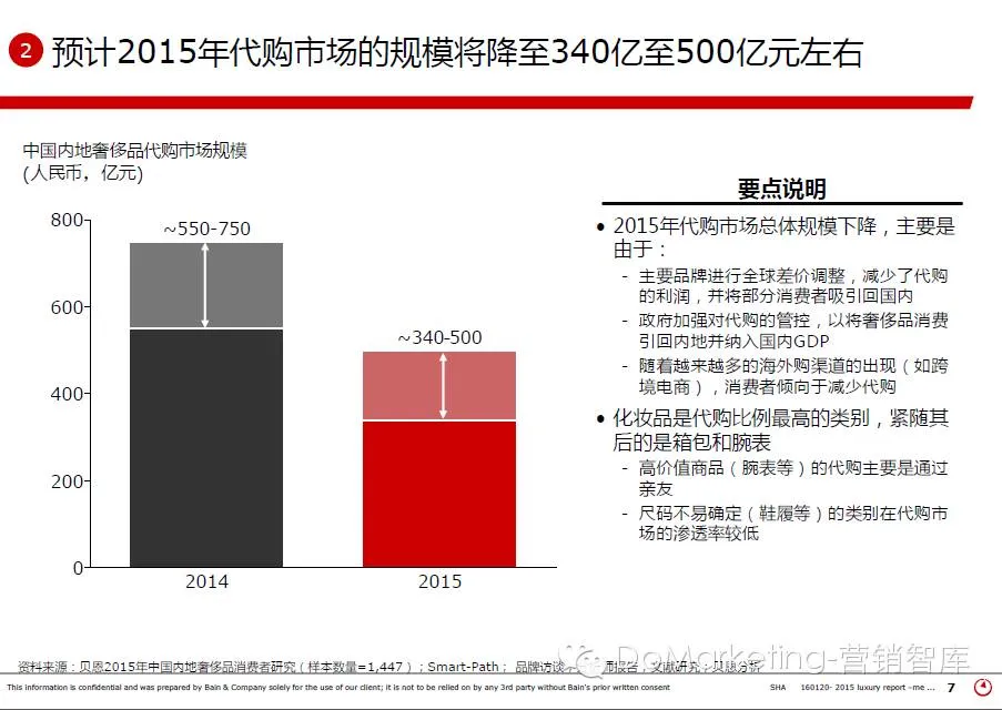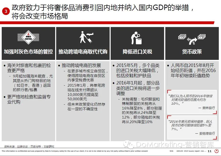 趋势七:2016年展望:预计宏观环境将无大幅波动,崛起的中产阶级将变得更成熟、更了解奢侈品;名品折扣店和海外购渠道将保持增长(代购市场规模则将下降),同时,领先品牌引导的全球价差调整举措以及政府致力于将奢侈品消费引回内地的措施可能会刺激国内销量增长。