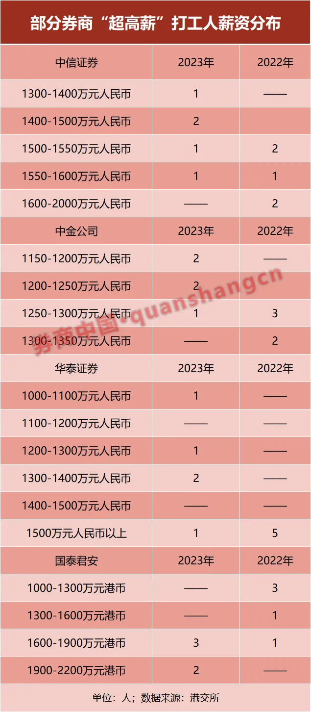 头部券商中信证券2022年原本有2名员工能拿到1600万元—2000万元人民币的薪酬,但2023年该数据为0。