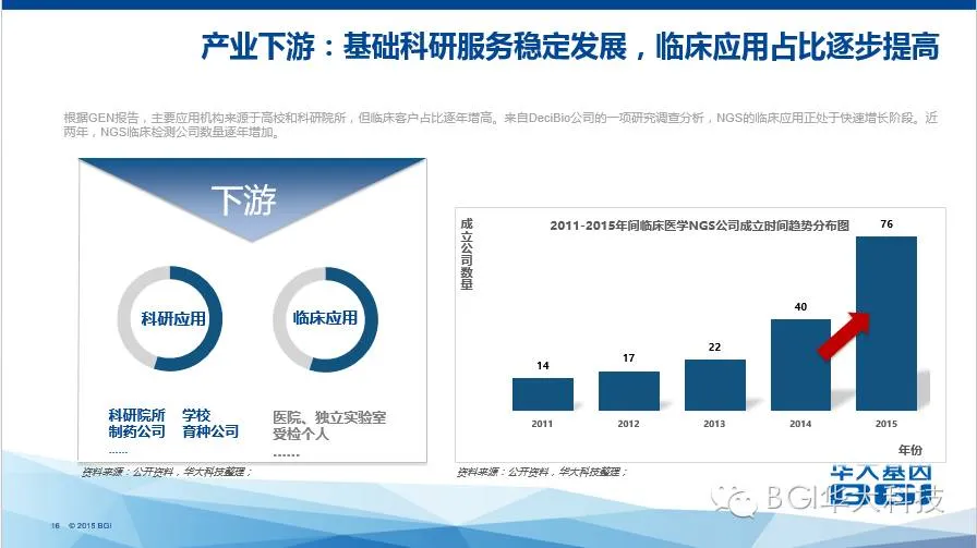 基础科研服务市场容量增速放缓,各公司争先布局精准医学、健康管理等,向临床测序领域转型,未来会出现众多数量的第三方检验机构、医学检验所或高端体检中心。