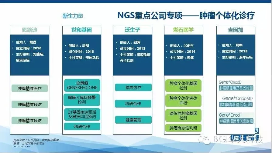 基因大数据/云计算作为有效的解决方案以应对NGS所产生的海量数据,从而衍生出一批专注云平台的新秀,如聚道科技、奇云诺德、其明信息、华点云等。