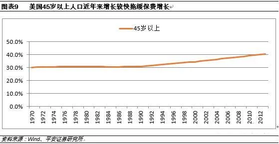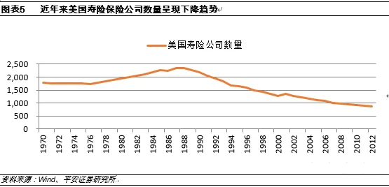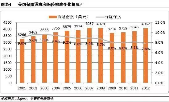 美国保险市场研究报告根据sigma披露的数据,2012年美国保险行业保费收入12720亿美元,2011年为12215亿美元,2010年为11622亿美元。2012年美国保险行业保费收入在全球保险业保费收入占比为27.38%(2012年全球保费收入46460.4亿美元),保费规模和市场份额稳居世界第一位,其次是日本(14.6%)和英国(6.94%),中国大陆则排名第四位(5.28%)。2012年美国寿险行业保费收入5588.77亿美元,2011年为5437.04亿美元,2010年为5067.09亿美元。2012年美国寿险保费收入在全球寿险保费收入中占比21.47%,排名世界第一位。其次是日本(19.77%)和英国(8.11%),而中国大陆则排名第五(5.33%)。2012年美国非寿险行业保费收入7031.28亿美元,2011年为6777.67亿美元,2010年为6554.5亿美元,2012年美国非寿险保费收入在全球寿险保费收入中的占比为35.21%,其次为日本(6.49%)、德国(6.3%)、英国(5.38%)、中国大陆(5.22%)。2012年美国保险深度为7.83%,排名世界15位;其中寿险保险深度为3.5%,非寿险保险深度为4.33%。整体看美国非寿险市场比寿险市场更为发达。从世界范围看,应该为排名第六(11.89%),中国大陆地区排名48位(2.98%)。2012年美国保险行业保险密度(人均保费)为4052.1美元,其中寿险密度1812美元,非寿险密度2240美元。从保险密度角度看,美国保险密度在世界各国中仅排在第10名。前三分别为瑞士、荷兰和丹麦。日本以5160美元排名第四,英国以4624美元排名第七,我国台湾地区以3763.5美元排名第13位,中国大陆则以178.9美元排名第62位。从美国保险公司数量变化看1988年后,美国寿险保险公司数量呈现递减的状态,截至2012年美国寿险公司为868家。这种变化与美国国内的保险监管政策有很大关系。美国《现代金融服务法案》颁布之前,美国保险监管有各个州单独进行。《法案》颁布后,很多公司在各州设置的子公司,或转为分公司,或实现合并,因此我们看到从上世纪90年代之后,美国寿险保险公司主体数量呈现明显减少趋势。美国保险业发达有其特殊性,尤其是寿险保险业。美国从1933年后虽然也建立了相应的社会保障体系,但是相对于西欧国家,美国社会保障体系是不足的,因此美国实际上是向寿险保险行业和健康保险转移了更多的保障职能,而这类转移的职能,在很多国家实际上应该由政府承担,比如中国门诊报销的社保体系是由政府主导的法定保险完成,而在美国更多通过商业保险来承担这一职能。我们在对美国保险业趋势进行研究的过程中,由于采用的是时间序列数字,因此我们采用wind下载的数据。Wind数据与sigma数据的会存在差别,这种差别主要可能来自于是以美国本土市场为统计范围还是以美国公司为统计范围。我们认为选择更早的数据进行分析意义不大,因此我们选取1970年代之后的寿险公司收入数据作为基础数据进行数据分析。我们选取wind披露的美国寿险保费收入、年金和医疗保险费之和作为指标,从而分析GDP增长变化对寿险保费收入的影响。美国寿险行业保费在1985-2000年之间增长明显加快,而在2000年后呈现放缓趋势,2008年金融危机,使得2009年保费呈现较大程度的负增长,但2010年寿险行业保费迅速回升至2008年水平。上世纪70年代至1985年左右,美国寿险保费复合增速大体与GDP复合增速相同,1985年至2000年,美国GDP增长放缓,大体维持在5-7%之间,但是同期寿险行业保费收入增速并未呈现明显下降趋势。这主要因为1984年美国税收改革法案出台,极大促进了401k和IRA等税收递延养老金的发展,政策支持这一时期保费呈现高于GDP增长的局面。因此在这一期间,美国GDP的复合增速只有5.9%,而寿险保费增长的复合增速为8.7%。2000年后美国寿险保费增长进入平稳期,主要因为美国养老和医疗需求的稳定,美国GDP增速放缓也是这一时期寿险保费增长平稳的原因。GDP对保险深度影响很大,2000-2008年,美国GDP增速放缓,但是同期保费收入增长较快,因此在此期间保险深度一直处于增长的趋势。但是2008年金融危机发生后,一直到2012年保险密度才恢复到金融危机之前的水平,这一期间保险深度反而是下降的。从人口结构的变化,我们也可以分析出人口结构变化对寿险保费增长的影响,人口出生率和老龄化背后的逻辑,则是暗含着不同人群对养老、医疗、以及传统保险服务的需求。从数据结构中可以看到1970年代-1985年之间,0-17岁人口占比呈现快速下降趋势,这说明从1970年代开始的“babyboom”在上世纪80年代中期正在逐渐消退,随着保障体制的完善和税收优惠体制的简历,这部分人群在1985-2000年之间,逐渐成为保险产品购买的主力。而在2000年以后,0-17岁人群的占比逐渐稳定,说明美国的出生率趋于稳定状态。在1970-2000年左右,我们发现18-24岁人群占比相对稳定,而25-44岁的人群占比呈现逐年上升的趋势,这部分人群很大程度上是70年代初babyboom期间的人群逐渐长大并参加工作。在这一区间,25-44岁人群对于保险的需求最为强烈,一方面相对于25岁以下人群,这部分群体具有购买能力,另一方面相对于45岁以上人群,这部分群体受教育的程度较高。情况也的确如此,2000年后这一年龄段的人群占比降至30%以下,并逐年下滑,美国寿险保费增长呈现放缓趋势。2000年后,美国人口还呈现一个最为显著的特征,就是25-44岁人群占比下降,而45岁以上人群占比显著上升,这说明从人口结构看,美国正在逐渐步入老龄化社会,而缴费群体呈现下降的局面。