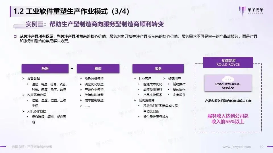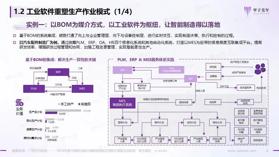 以BOM为媒介方式,以工业软件为枢纽,让智能制造得以落地 云上的工业软件,提振制造业产业链实现数字化能力升级与大协同作业 顺应用户市场对价值体现的改变,工业软件帮助生产型制造商向服务型制造商顺利转变 AI赋能的工业软件,在关键生产环节带来了质量提升与成本收益