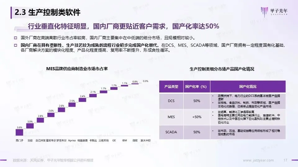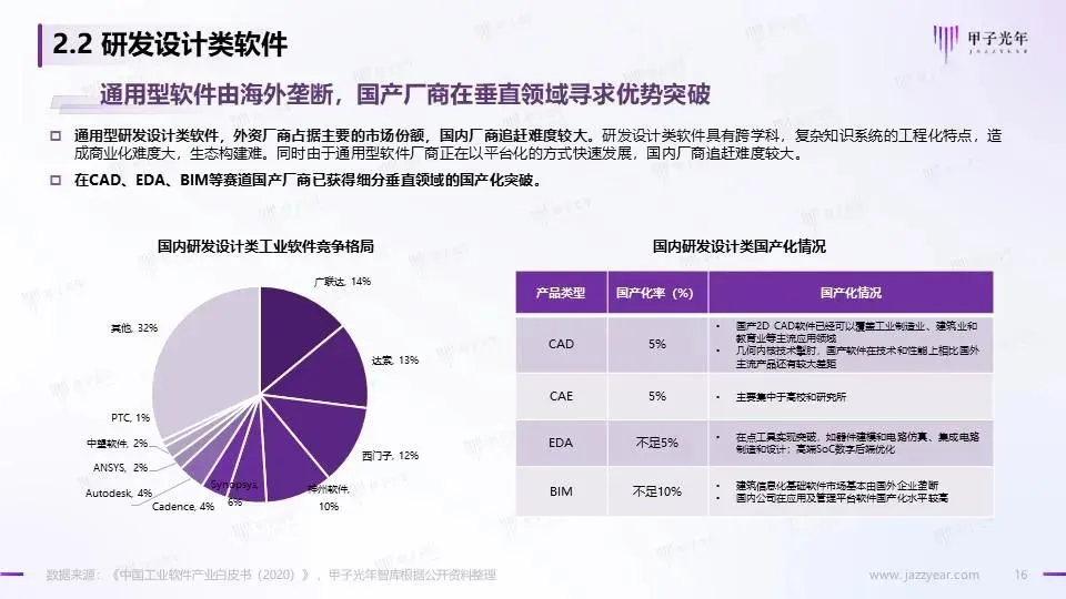 我国开始进入工业化进程后期,工业软件需求敞口大,国内工业软件市场增速高于全球 研发设计类软件:通用型软件由海外垄断,国产化率较低,国产厂商在垂直领域寻求优势突破 生产制造类软件:行业垂直化特征明显,国内厂商在具有垄断性、生产技艺较为成熟的流程行业初步完成国产化替代