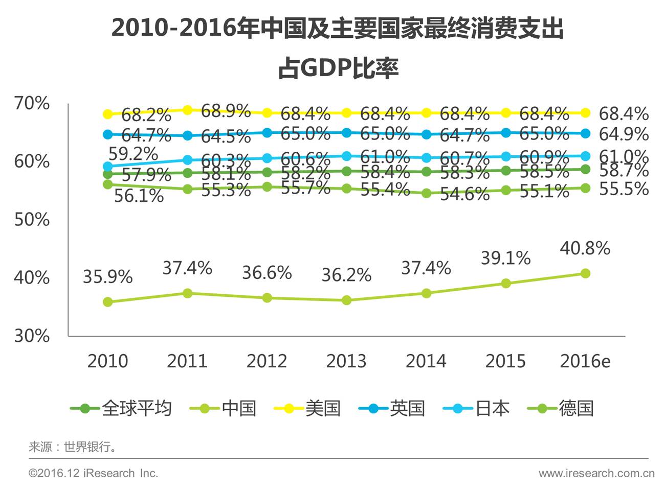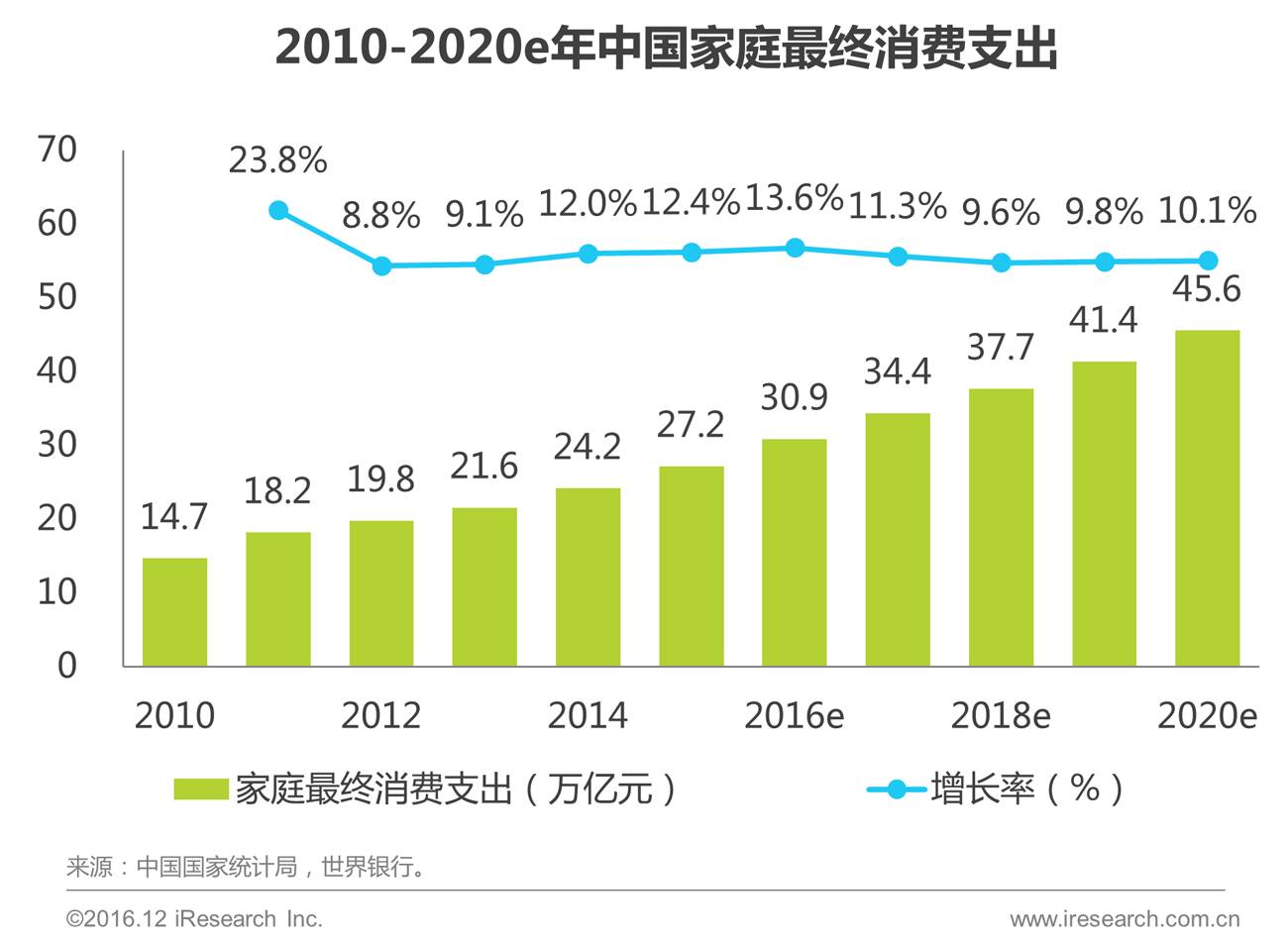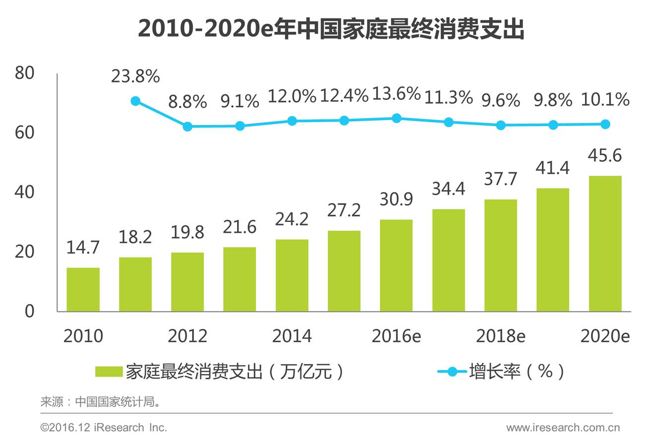 自2012年起,我国家庭最终消费保持连续四年加速上升,截至2015年,中国家庭最终消费超过27万亿人民币。但即使如此,目前我国最终消费占GDP比重仍远低于全球平均水平。艾瑞分析,我国消费市场上升空间巨大,原因在于以下三个方面:第一,消费环境的逐渐丰富。在国家政策的推动和商业及娱乐环境的升级作用下,未来国人将有更多的场景进行消费;其次,消费金融平台的加速推动。随着互联网消费金融的崛起,消费场景的重要性已成为业界共识,很多消费金融平台的业务模式都开始向消费场景端渗透,它们自身的发展也会丰富居民消费环境,进而刺激消费;第三,年轻群体的消费意识的改变。作为消费市场主力军的年轻人群体,消费需求较高,其消费增速或远超我国家庭消费增速。随着这部分人群的逐渐成熟,我国的消费规模将进一步提速。