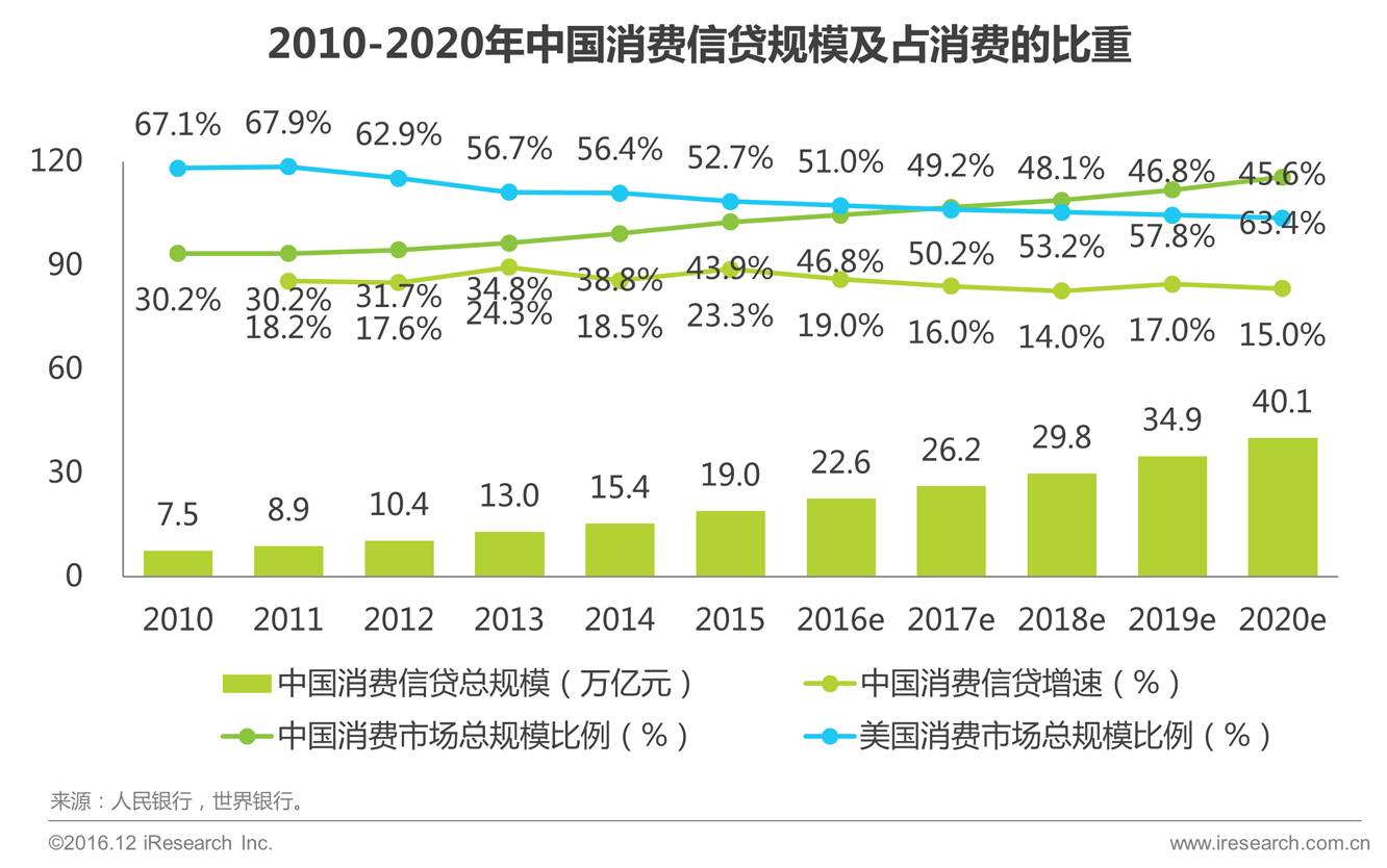 2015年中国储蓄率为37.6%,达到了近5年来的最低点,但即便如此,与世界其它国家相比,我国储蓄率仍严重偏高。不过我国消费市场的快速增加有望改变我国高储蓄率格局。同时,消费的增加也带来了更多的消费金融的市场空间。随着消费金融服务形式的多样化发展,以及越来越多的消费场所提供信贷业务,我国的消费金融市场将步入一个急速扩张的时期。
