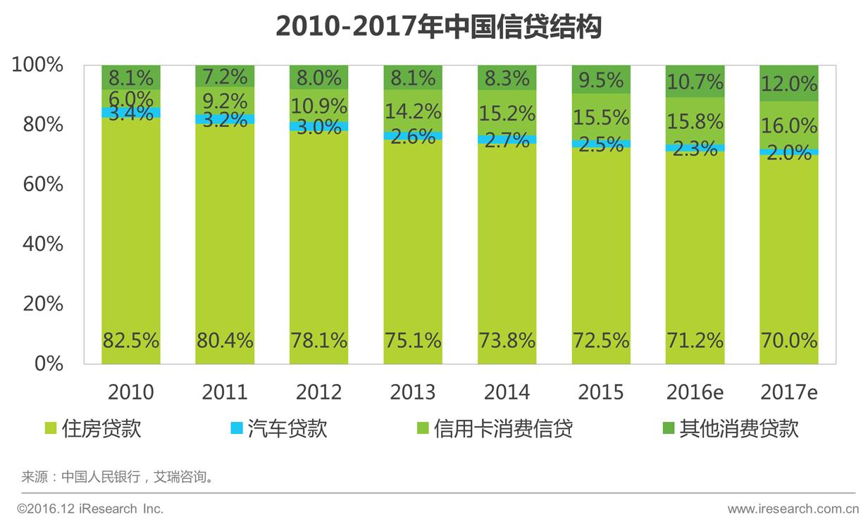 从2010年以来,房贷在消费信贷中所占的比例不断减小,信用卡消费信贷及其他消费信贷占比逐渐提升。由此可以看出,我国居民对信贷业务的需求从主要局限于购房,购车等大额融资,开始转移到3C产品、旅游、服饰、食品等日常生活消费品。而且随着电子商务以及网络分期等新型互联网消费及金融模式的不断推动,市场接受程度的不断增加,未来非房产汽车类的消费信贷会有更大的增长潜力。