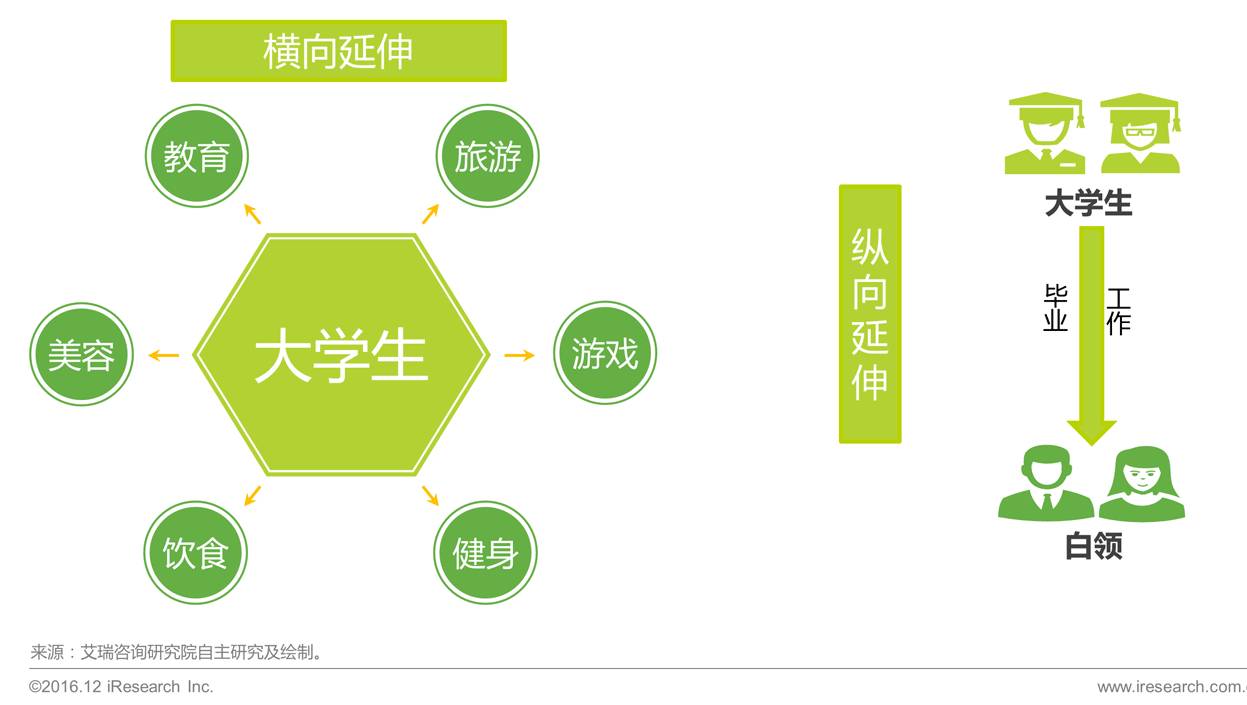 大学生消费金融市场的延伸,一方面是基于消费场景的横向延伸。大学生的消费场景极其丰富,因此目前以3C产品与品牌服饰为主的大学生消费金融市场会延伸至教育、旅游、美容、游戏等各个细分市场。而且大学生消费金融平台会以战略合作的形式与各细分领域的厂商联手为大学生提供分期、信贷等金融服务。另一方面是基于大学生群体的纵向延伸。大学生群体一定会面临的就是毕业和工作,这种身份的转换必然会带来的是大学生消费金融市场向白领消费金融市场的纵向延伸。