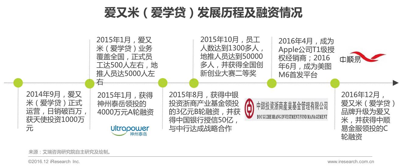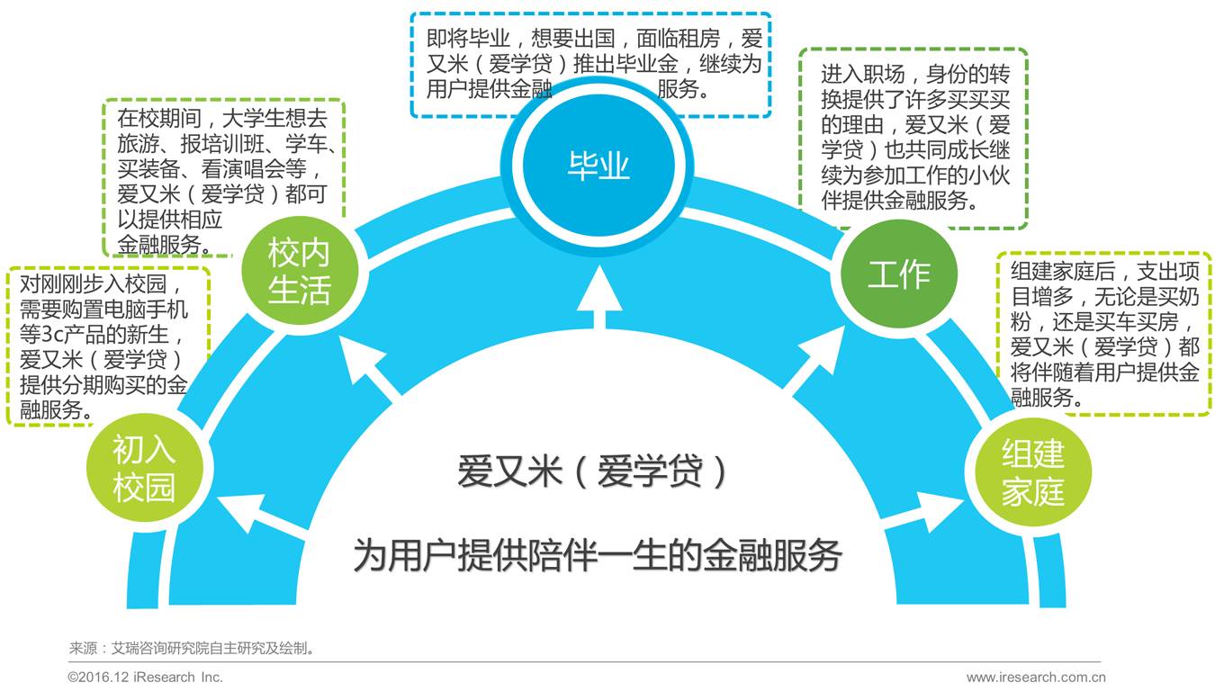 爱又米(爱学贷)以大学生作为消费金融市场的切入点,采取伴随战略,与用户共同成长,在用户不同的阶段为其提供专业的金融服务。爱又米(爱学贷)立足消费场景,围绕个人成长的主线,在用户无论是毕业,还是第一次出国,第一次买车,第一次买房等等最有借贷需求的时候提供金融服务。
