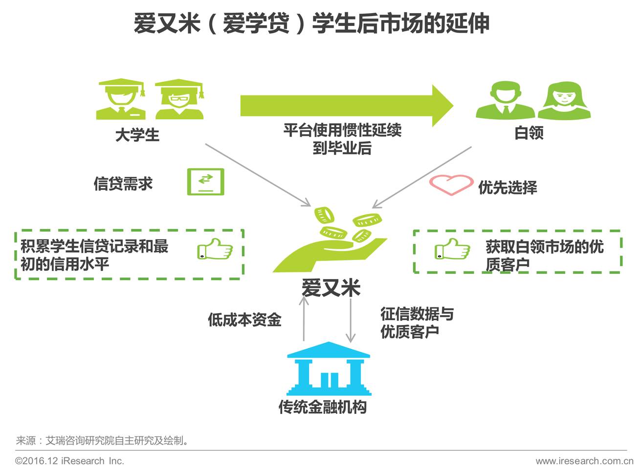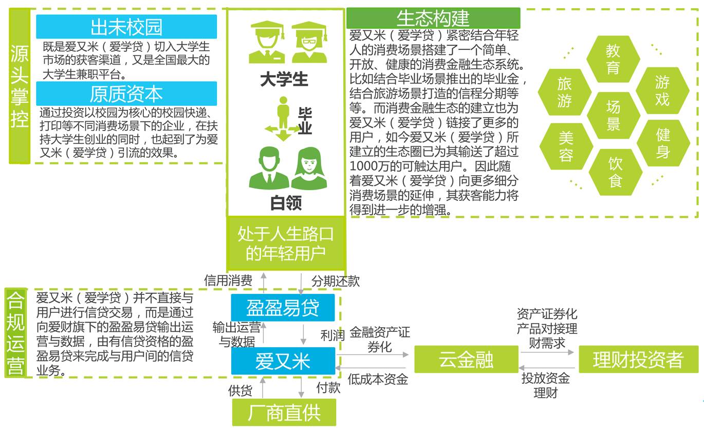 服务于大学生的爱又米(爱学贷)通过为大学生提供分期消费,现金贷款等金融服务,积累了学生的信贷记录和最初的信用水平。当其服务过的这些大学生毕业后,遇到金融问题时,他们对爱又米(爱学贷)的依赖性和友好度会更高一些,将优先选择爱又米(爱学贷)继续为他们服务。同时爱又米(爱学贷)一方面通过场景拓展和用户延伸降低了获客成本,另一方面又通过与传统金融机构合作,将征信数据与优质客户输送给传统金融机构,并获取低成本的资金。