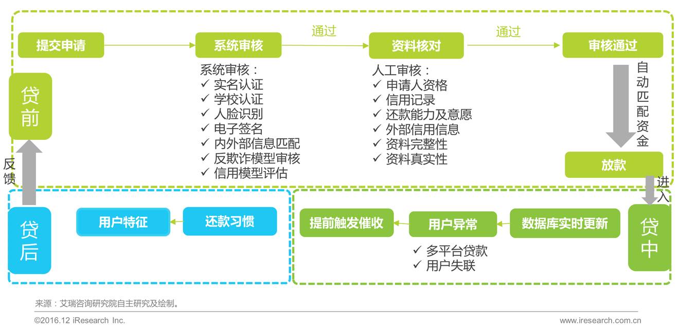 爱又米(爱学贷)建立了覆盖贷前、贷中、贷后全流程的风控模型和风控系统。贷前:风控模型分为反欺诈模型和评分模型,会综合用户的身份信息、学校信息、人脸识别、联系人信息、用户操作行为信息及多家数据源信息等维度对用户进行分层,其中部分用户需要进行人工审核,信审人员利用丰富的个人工作经验对申请人资料、信用记录、还款能力及意愿等进行核对,(风控系统综合人工审核和系统审核)最终做出授信审批;贷中:数据库实时更新,用户一旦出现多平台贷款等异常行为就会触发预警,提前触发催收;贷后:催收模型利用用户基本信息、用户消费信息、用户历史还款行为信息、用户操作行为信息等来对不同的用户制定不同的催收策略,并评估催收效果,此外催收的信息还将实时地返回给大数据平台,用于下次贷前审核参考。