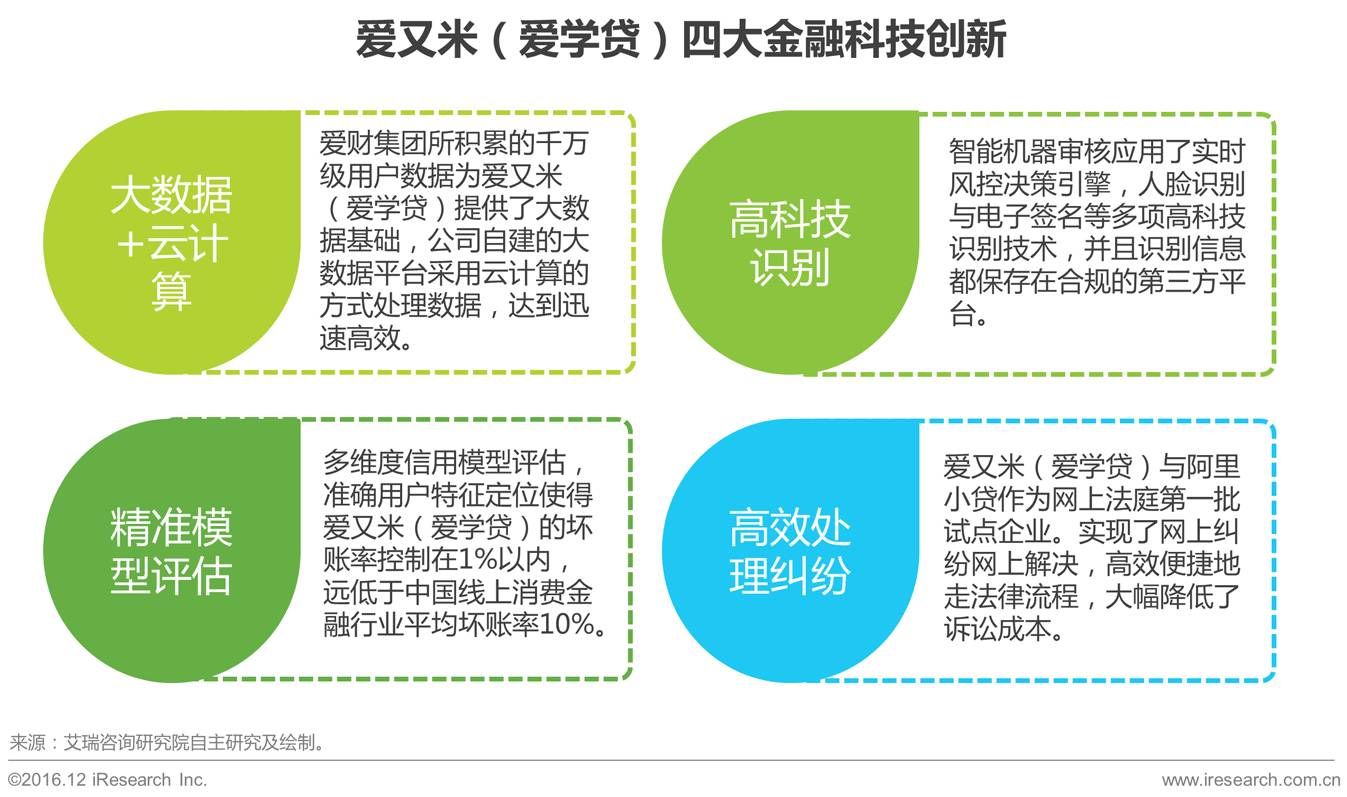 爱又米(爱学贷)围绕精准与高效两个维度进行了金融科技方面的创新。精准维度,一方面通过人脸识别与电子签名等高科技识别方法实现了用户身份的精准识别,另一方面通过多维度信用模型的评估,精准地审核用户的还款能力来匹配放款额度。高效维度,爱又米(爱学贷)自建大数据平台,并通过分布式计算的方法实现审核效率的高效化,而且爱又米(爱学贷)作为网上法庭的第一批试点企业,实现了法律纠纷的高效处理。