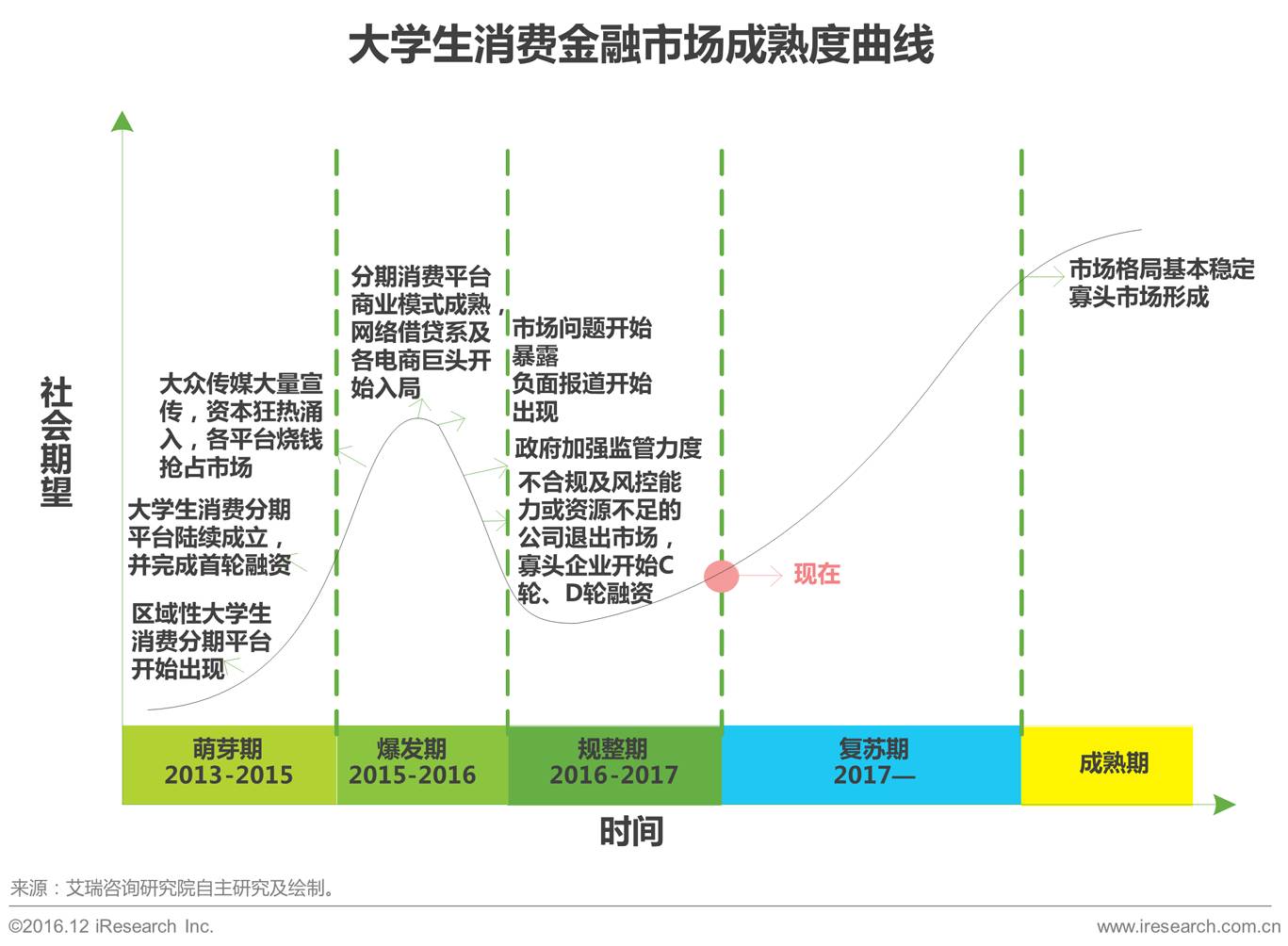 2013年,大学生消费金融市场开始进入萌芽期,在后面的一到两年的时间内随着社会资本及电商巨头的涌入,2015年左右市场开始步入爆发期,与此同时野蛮生长所带来的“裸贷”及“暴力催收”等问题引起了社会的广泛关注。随着2016年初监管法案的相继落地,媒体负面报道的不断增加,部分市场巨头企业的退出及转型,大学生消费金融市场于2016年步入规整期。但是大学生消费市场的规模及借贷需求是不断增长的,因此2017年大学生消费金融市场或将迎来高速发展的复苏期。