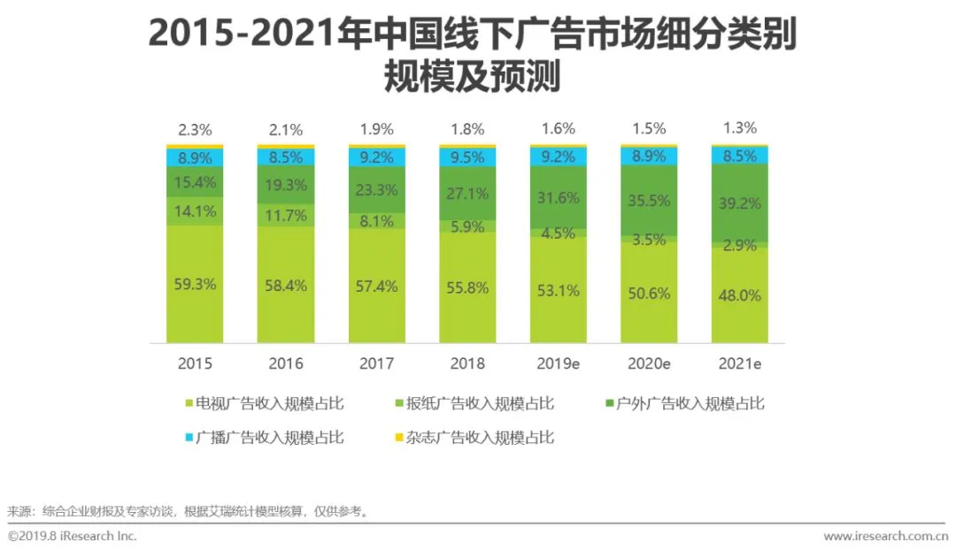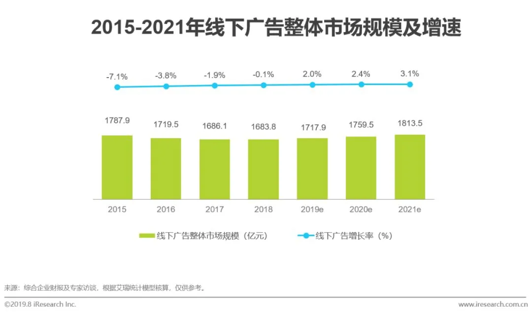 中国线下广告因受到互联网的冲击,在网络广告崛起的时期内持续低迷,整体规模在2015-2018年间呈现负增长趋势,从1787.9亿元跌落到1683.8亿元,但下滑幅度明显缩减,并在2018年趋近于0%。预计从2019年起,线下广告整体规模将从负增长回复至正增长,且增长率将逐年提升。2018-2021年间,线下广告规模预计将按2.5%的年复合增长率持续增长,并于2021年达到1813.5亿元。与其余类别线下广告因受消费者移动性增加影响而导致受众流失、市场规模收缩不同,户外广告场景化和强制性等的特征和数字化赋能的增强,使广告主对其的需求不断增强,成为拉动线下广告增长情况回暖与持续提升的主力军,预计到2021年,户外广告将占据整个线下广告市场规模的39.2%。