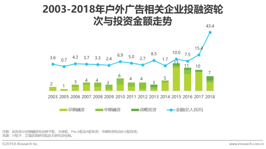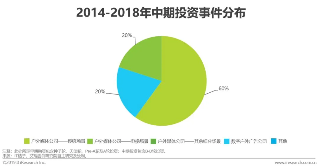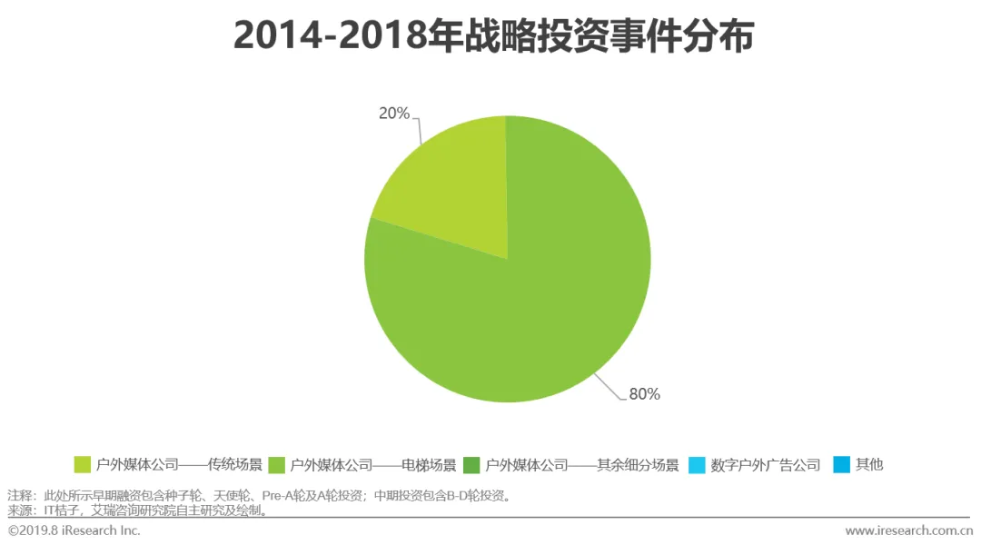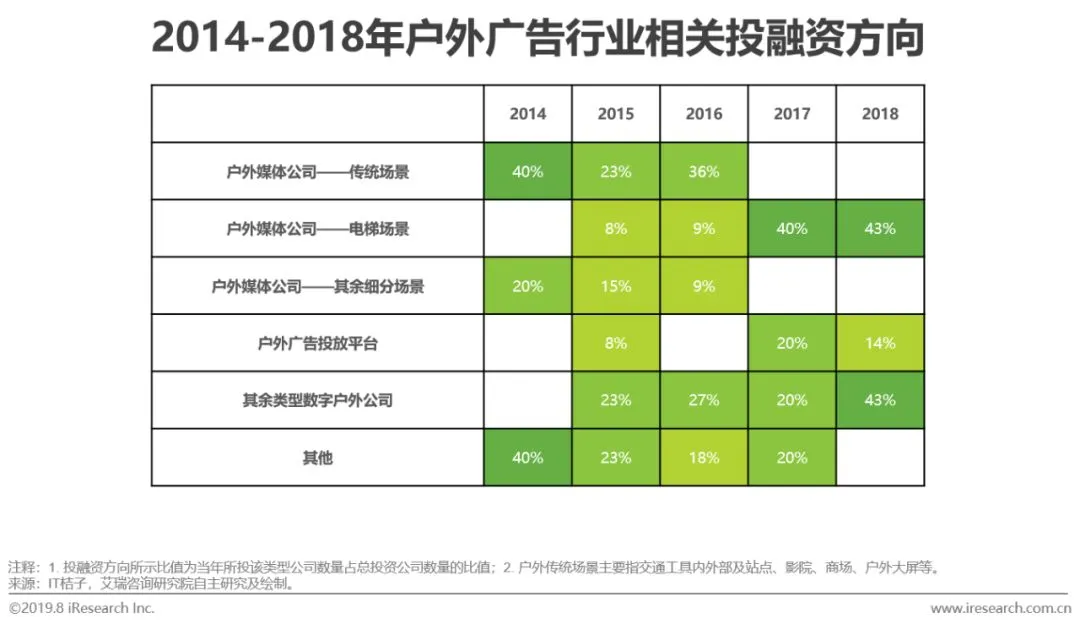 由近年投资方对户外广告相关企业的投资趋势得出,获得早期轮次投资的公司增多,战略投资方也从2013年起开始将眼光投向户外广告市场,并且,资金逐步向经营电梯场景的户外媒体公司和户外广告投放平台等数字户外公司方向集中。这是由于近年来数字户外兴起,除了科技巨头带头搭建数字化户外广告平台外,市场上也开始涌现出不少具有创新意识和发展潜质的数字化户外广告公司,吸引了资金的投入。另外,电梯是目前户外各场景中发展稳定且势头强劲的场景,也是投资方敢于投入大额资金的对象,尽管新兴细分场景不断在被开发,目前暂未出现势头能超越电梯的新场景。资金的追逐和支持进一步带动了数字化户外的发展和电梯场景户外媒体公司的壮大。