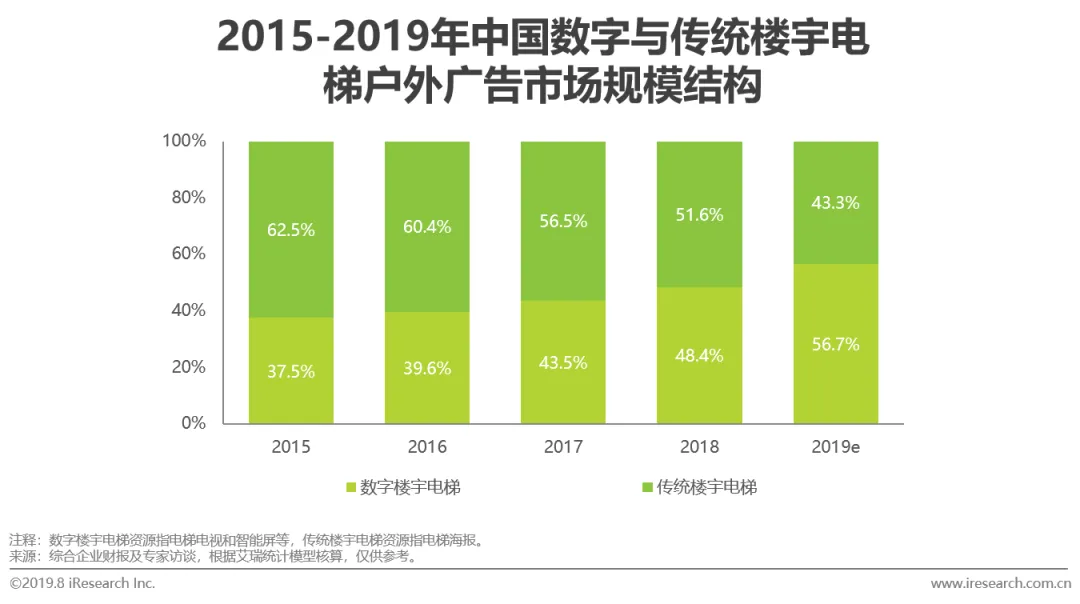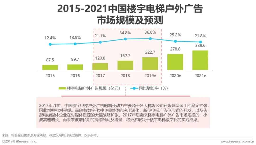 2018年规模达162.7亿元,同比增长率为34.8%根据艾瑞咨询数据显示,2018年中国楼宇电梯户外广告市场规模达162.7亿元,同比增长率为34.8%,未来楼宇电梯户外广告的发展势头依然强劲,预计2021年市场规模将达339.6亿元。艾瑞分析认为,中国楼宇电梯户外广告市场仍然有较大增量空间,主要原因有四:1)楼宇新建率的稳定上升;2)楼宇电梯商业化渗透率的不断提高,尤其是三线及以下城市所属的下沉市场;3)电梯空间中近年新开发广告位类型的普及和完善,在场所供应数量不变的情况下增加广告资源位;4)数字技术应用深化,提高广告承载量和利润空间,预计2019年楼宇电梯数字广告市场规模将首次超过传统楼宇电梯广告,而这也是楼宇电梯户外市场当前乃至未来发展最重要的推动力。
