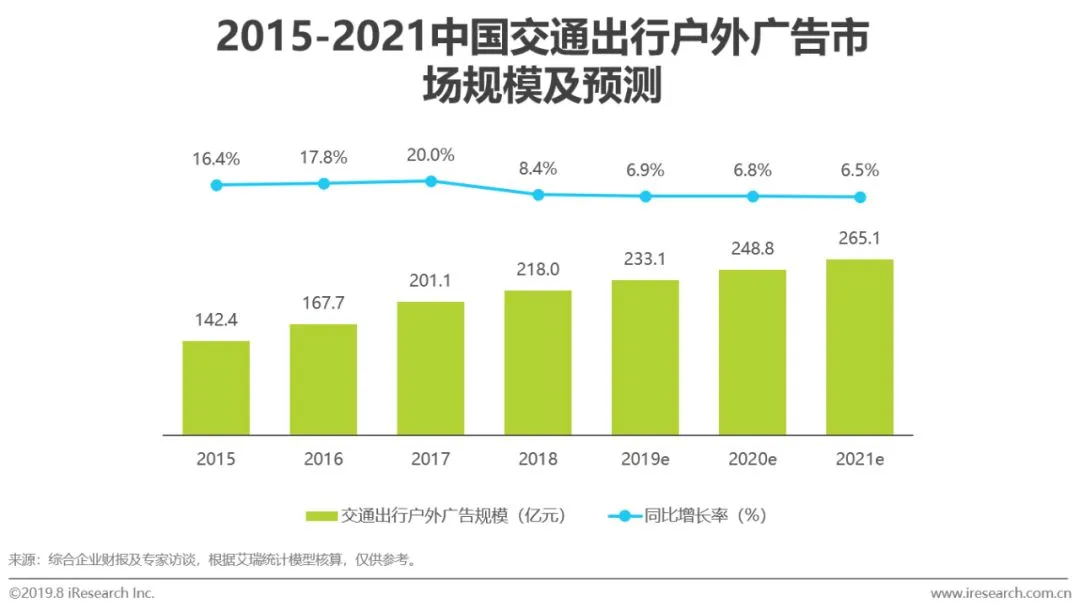 根据艾瑞咨询数据显示,2018年中国交通出行场景户外广告市场规模达218亿元,同比增长率为8.4%,随着机场、铁路、公交和城轨等交通网络的不断扩展,交通出行场景的户外广告规模也将维持着较为稳定的增速同步发展,预计市场规模将于2021年达到265.1亿元。