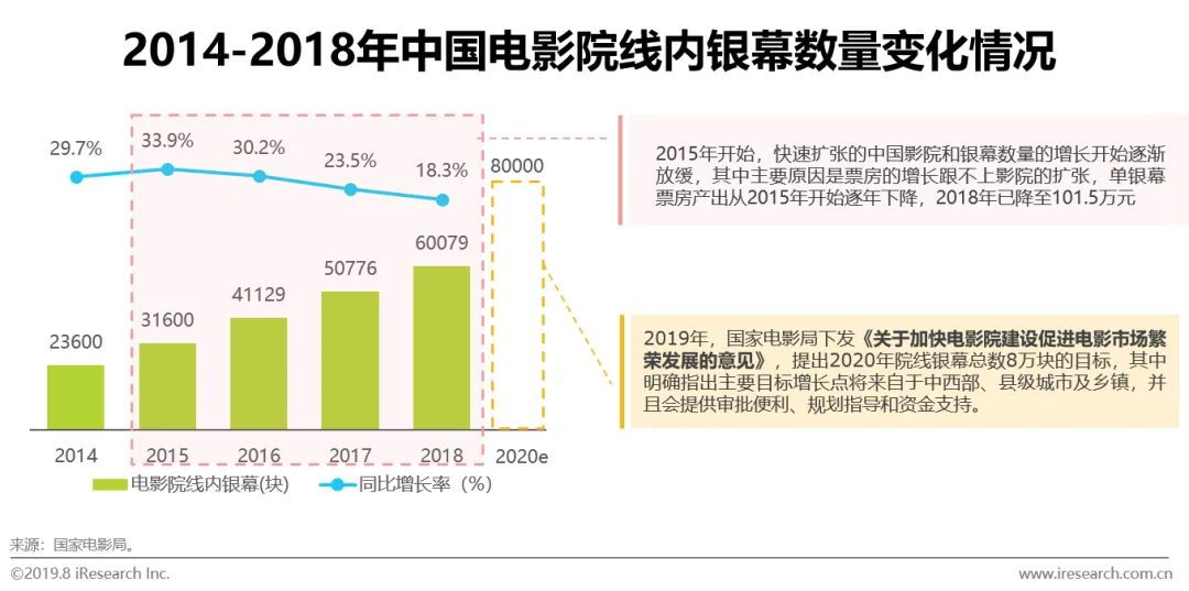 影院建设失衡,一线城市相对饱和,导致影院广告增长乏力在中国电影产业发展红利的背景下,电影院和银幕数量迎来了一段高速增长期,但同时也迎来了发展失衡、分布不均的产业问题。一方面,随着电影院产能过剩,单块银幕盈利能力逐步下滑,影院和银幕数量的增长也开始放缓,另一方面,大中城市的影院和银幕数量趋于饱和,而中西部和县级城市的影院银幕资源仍相对稀缺,在政策的带动下,未来影院银幕的增长点将向下沉市场转移。艾瑞分析认为,随着影院建设规划的结构调整和下沉,一线城市影院银幕数量增长将继续放缓,无法承担更多的广告投放,而中西部和县级城市的影院广告价值还有待进一步验证和开发,因此未来短期内,中国整体影院广告将不会再出现爆发式增长,而是逐渐转向精细化产业运营模式。投放建议:模型化