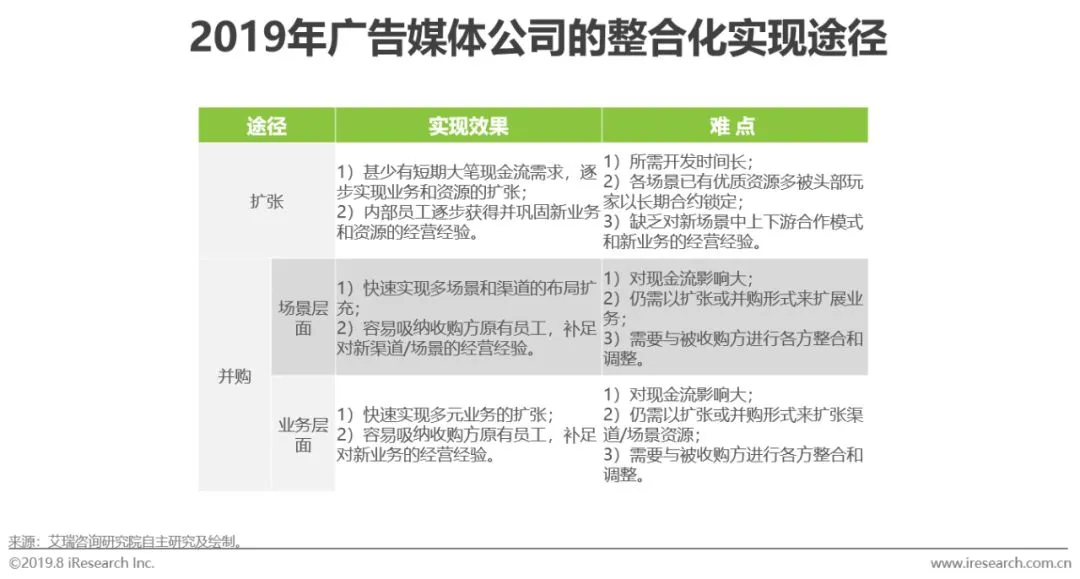 户外媒体公司:内部扩张和外部并购,满足市场的多元需求一方面,随着媒介环境和消费者注意力的不断分散,广告主已经很难通过单一的渠道或者屏幕实现营销触达,另一方面,面对日益复杂的营销环境,广告主的营销决策和执行时间周期也在不断缩短。在此背景下,媒介和业务的整合程度,成为广告主在选择广告媒体公司时最看重的因素。艾瑞分析认为,整合化趋势在户外广告市场同样适用,尤其是多场景的户外资源覆盖能力,将极大地减少广告主的多方渠道商务对接成本,满足整合投放的需求。因此,通过内部扩张和外部并购等方式实现整合化,将是未来户外媒体公司的重要竞争壁垒。