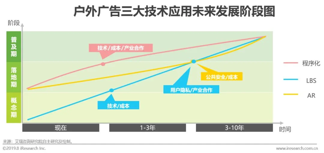 中国户外广告未来在程序化、LBS和AR的应用上将会先后经历概念期、落地期和普及期三个阶段。1)户外程序化当前已经进入落地期,各类企业相继推出户外程序化平台,覆盖资源和功能开发也不断在丰富完善,主要由于广告位数字化和资源整合的原因,未来十年内都将持续处于不断普及的发展阶段。2)户外广告与LBS技术的应用发展当前还停留在概念期,未来的落地与普及主要还取决于户外数字化发展的进程。3)户外广告与AR技术的应用发展尽管当前已经有落地案例,但由于技术成本以及场景适用性,未来将会有较长的落地期,以持续探索更加成熟的营销模式和玩法。整体来看,三大技术在户外广告的应用价值显著,将会吸引各方持续关注和推动其发展和深化,但同时其在不同阶段也分别面临着技术与成本、公共安全与用户隐私、产业合作与竞争等瓶颈与挑战,未来这些挑战的被解决程度,直接决定了三大技术应用的发展进程。