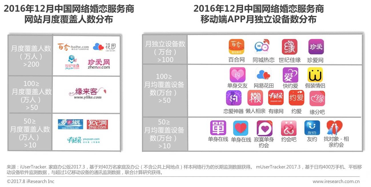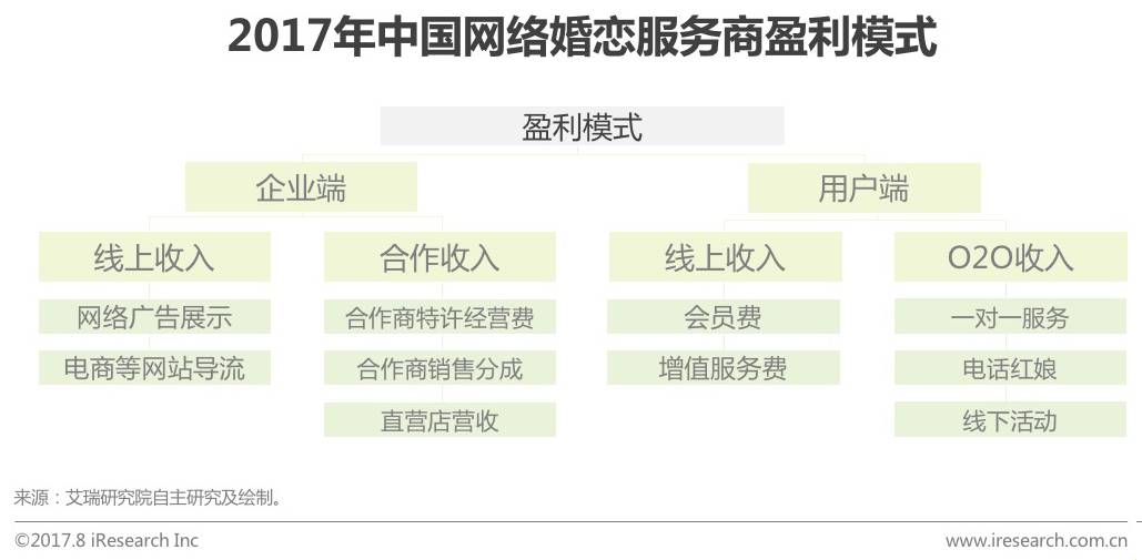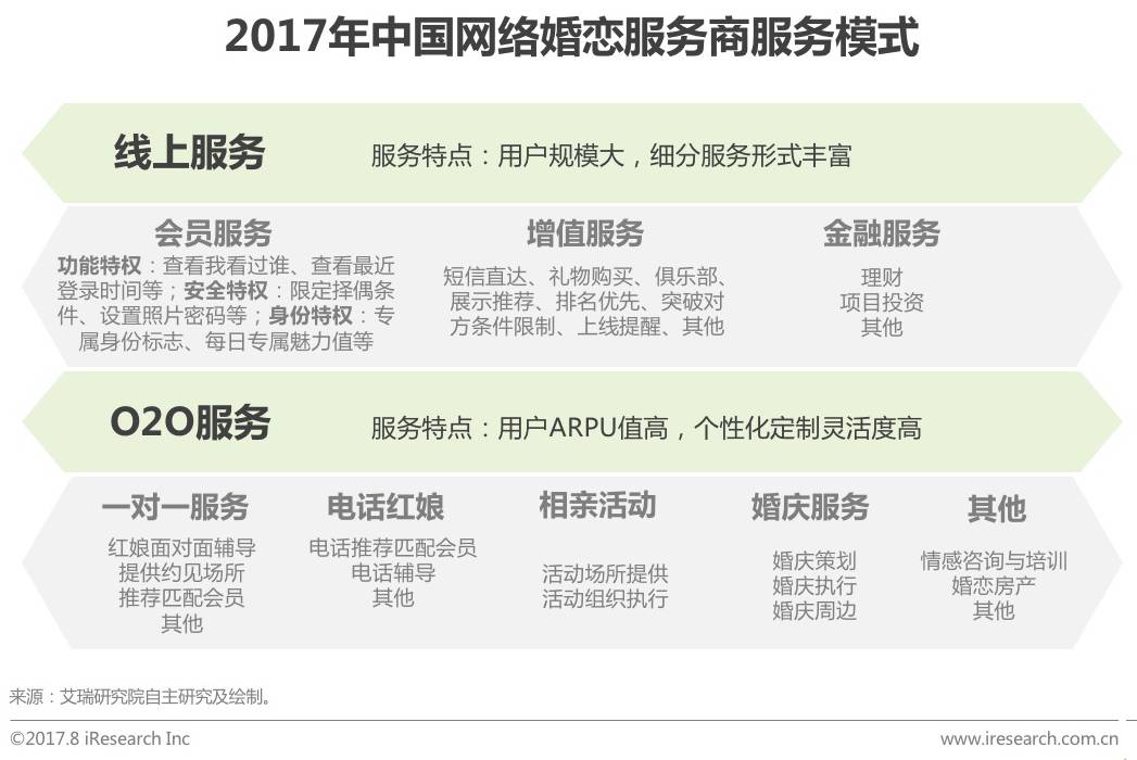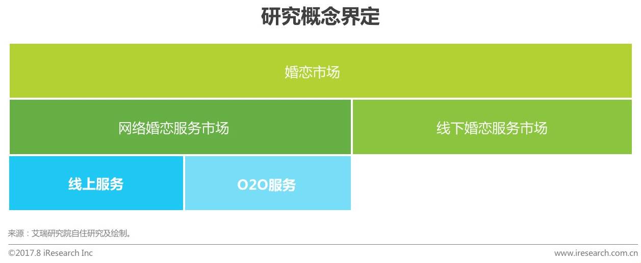 本报告研究范畴为网络婚恋服务市场,网络婚恋服务市场主要指用户以达成恋爱及婚姻关系为目的,以线上(互联网)为获取并建立关系的初期渠道,从而进行相互了解、沟通等行为,最终找到适合自己的恋爱或者结婚对象的服务。网络婚恋服务按服务方式划分,分为线上服务(会员服务和增值服务)和O2O服务(线下一对一红娘、电话红娘、相亲活动和婚庆服务等)。