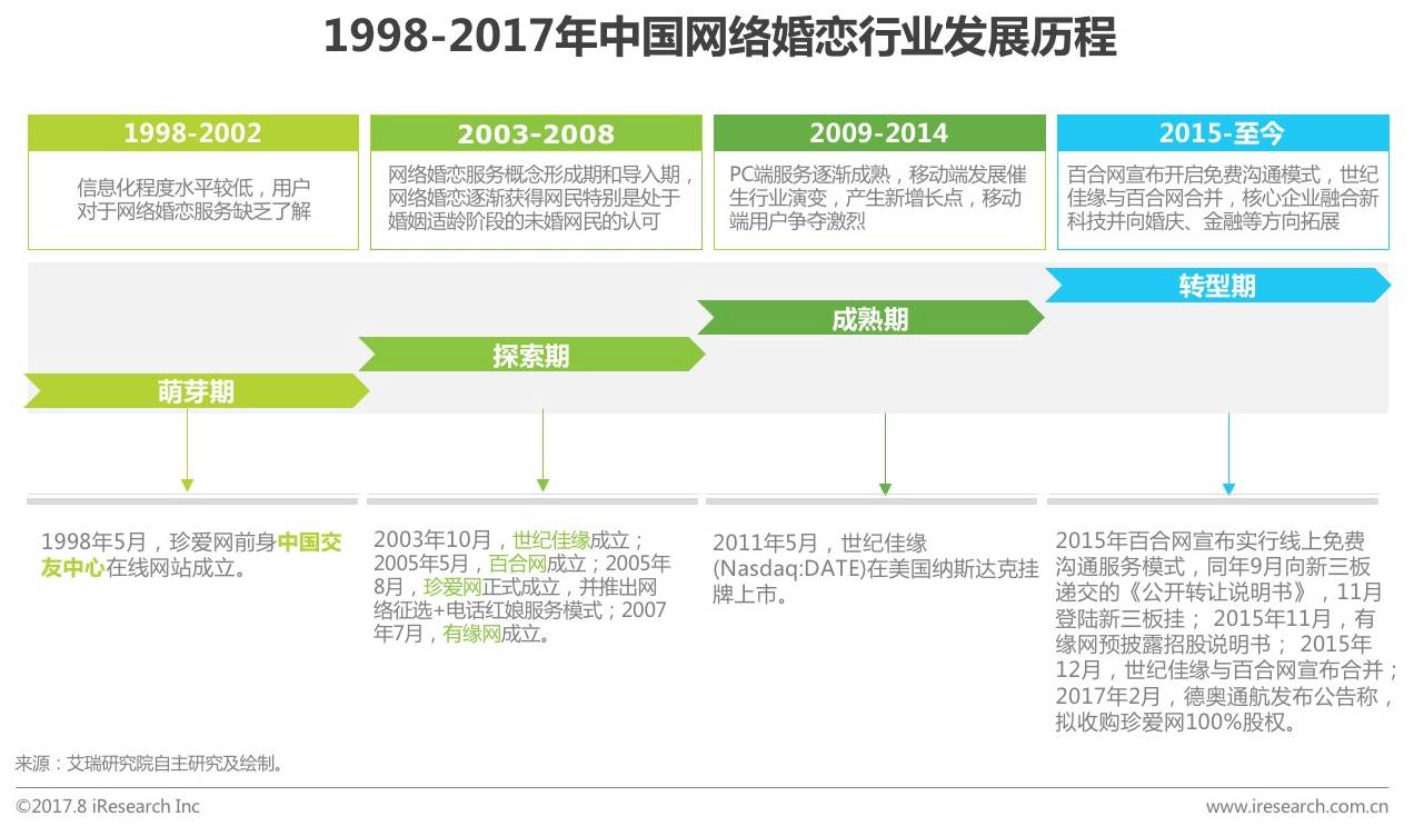 1998年珍爱网前身中国交友中心在线网站成立,标志中国网络婚恋行业进入萌芽期。2003年行业进入探索期,世纪佳缘、百合网、珍爱网等网络婚恋企业相继成立。随后经过近8年的发展,核心企业服务模式探索完成且营收增长稳定,行业进入成熟期。2015年之后,在资本运作和互联网技术不断发展的背景下,企业竞争格局发生变化,且不断探索创新服务模式,行业进入转型期。