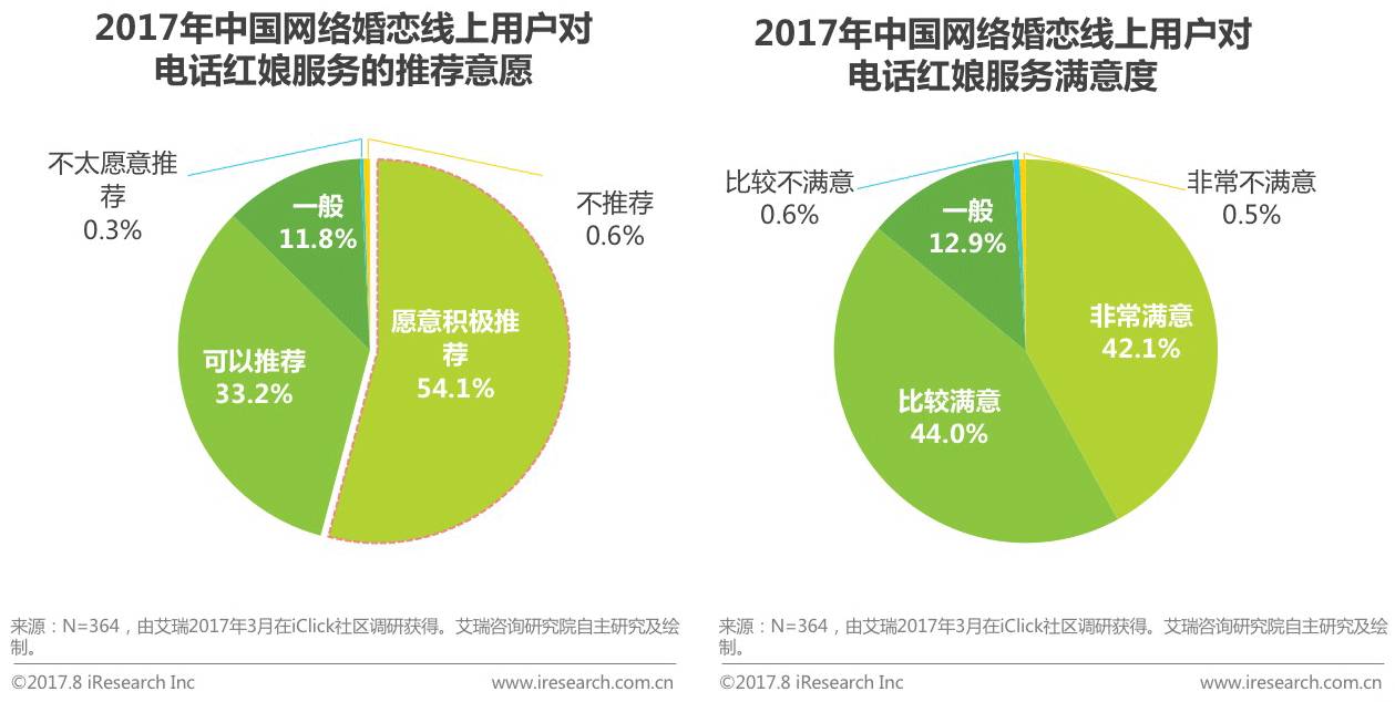 根据艾瑞调研数据显示,线上用户中使用过电话红娘服务的用户对服务的推荐意愿和满意度均较高。其中愿意积极推荐用户占比为54.1%,可以推荐的用户占比为33.2%,此外,在满意度调研中,满意用户总占比高达86.1%,非常满意的用户占比42.1%,比较满意的用户占比44.0%。