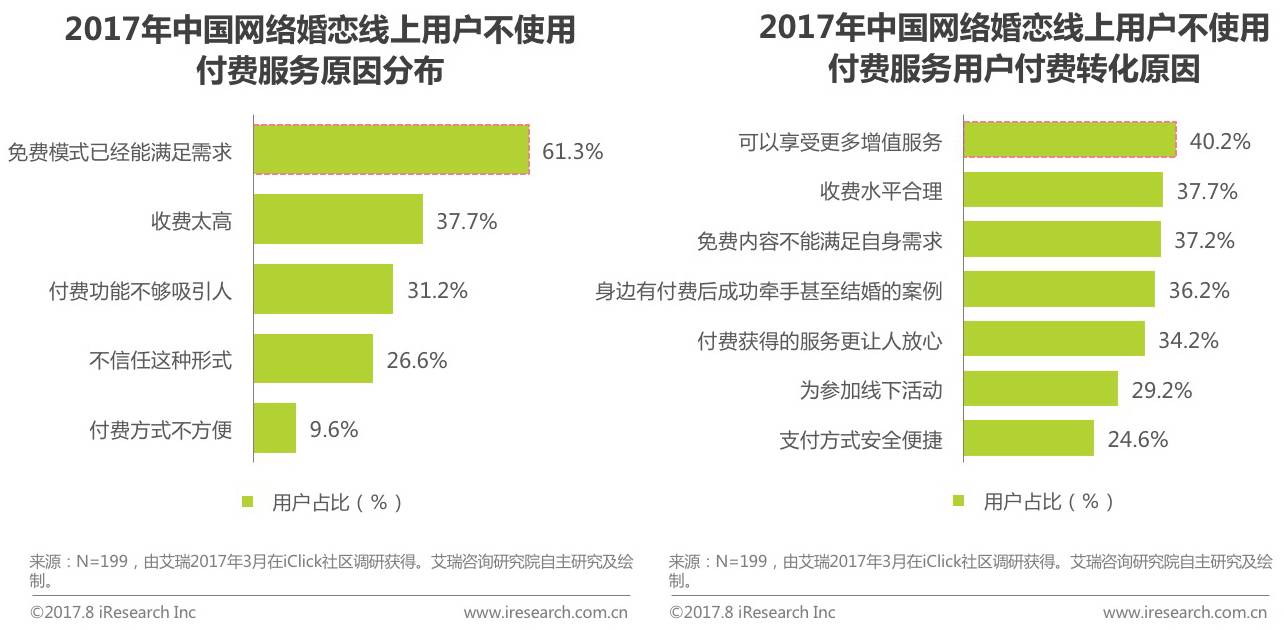 根据艾瑞调研数据显示,中国网络婚恋线上用户在不使用付费服务原因的选择中,免费模式已经能满足需求占比最高为61.3%,此项数据表明,随着中国网络婚恋免费服务的逐渐放开,付费用户占比会因此产生一定影响。除此之外,用户不付费原因各项用户占比分别为收费太高37.7%、付费功能不够吸引人31.2%、不信任这种形式26.6%和付费方式不方便9.6%。而针对不付费用户付费转合的调研显示,有40.2%的用户会在可以享受更多增值服务时使用付费服务,未来对于网络婚恋服务商而言,针对增值服务的进一步探索和创新会是服务发展重点之一。