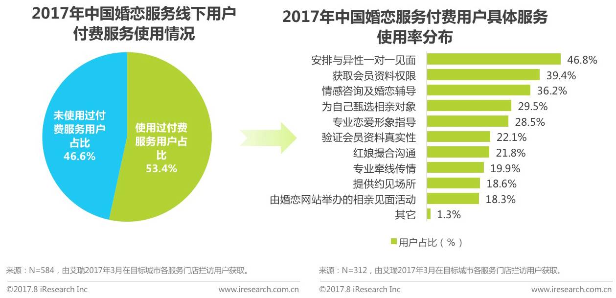 根据艾瑞调研数据显示,线下用户中使用过付费服务的用户占比为53.4%,未使用过付费服务的用户占比为46.6%。而在付费用户中,安排与异性一对一见面服务的使用率最高占比为46.8%,其次为获取会员资料权限占比为39.4%。