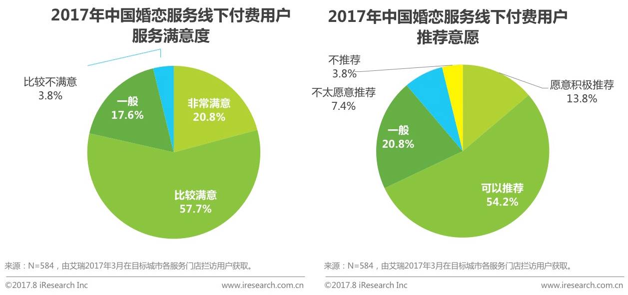 根据艾瑞调研数据显示,线下付费用户对于婚恋服务的推荐意愿和满意度均较高,满意用户总占比高达78.5%,推荐用户总占比达68.0%。在满意度方面,非常满意的用户占比20.8%,比较满意的用户占比57.7%。在推荐意愿方面,愿意积极推荐的用户占比13.8%,可以推荐的用户占比54.2%。