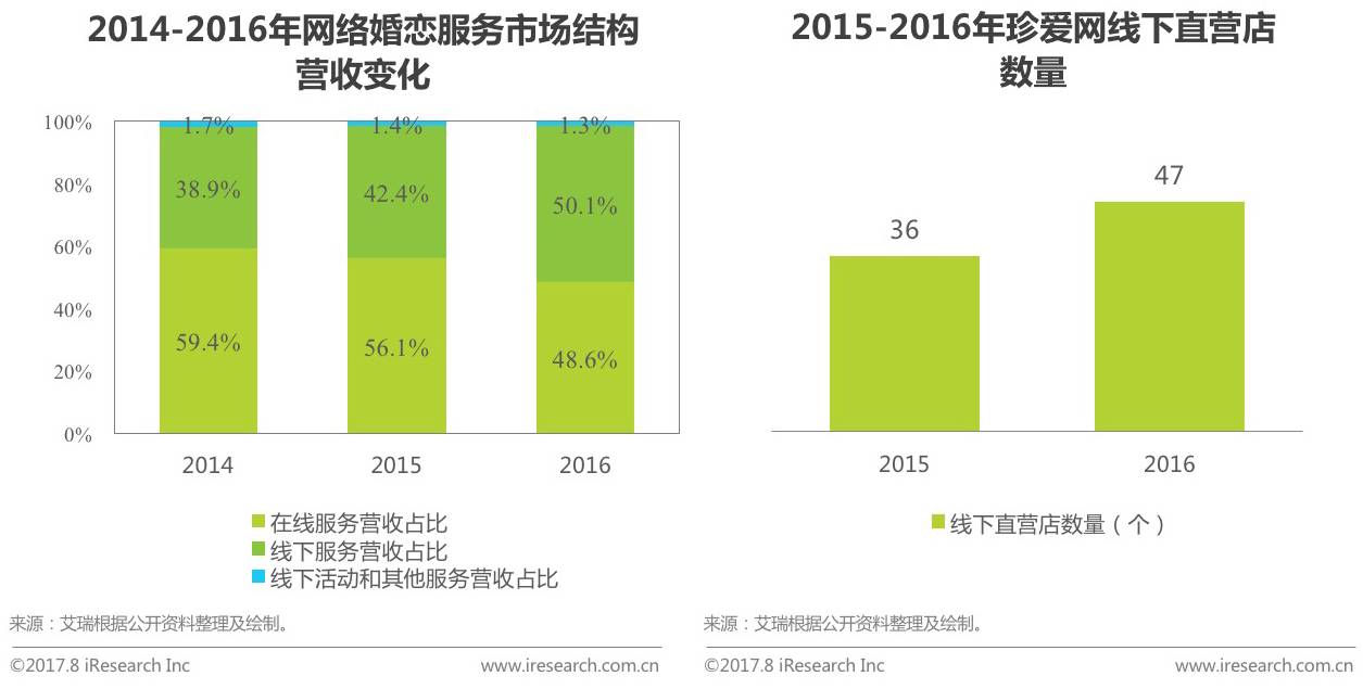 艾瑞根据公开资料整理,在网络婚恋服务市场营收结构占比中,在线服务营收占比2014年为59.4%,而到2016年在线服务营收占比为48.6%,降低10.8%,而O2O线下服务营收占比由38.9%增加到50.1%,重要性不断提升。此外,根据珍爱网官网显示数据,2016年其线下直营店由2015年的36家增加到47家,对于O2O线下服务的布局也在持续加速中。未来,随着线上免费服务的逐渐放开,核心企业对于O2O业务布局的重视程度将进一步提升。