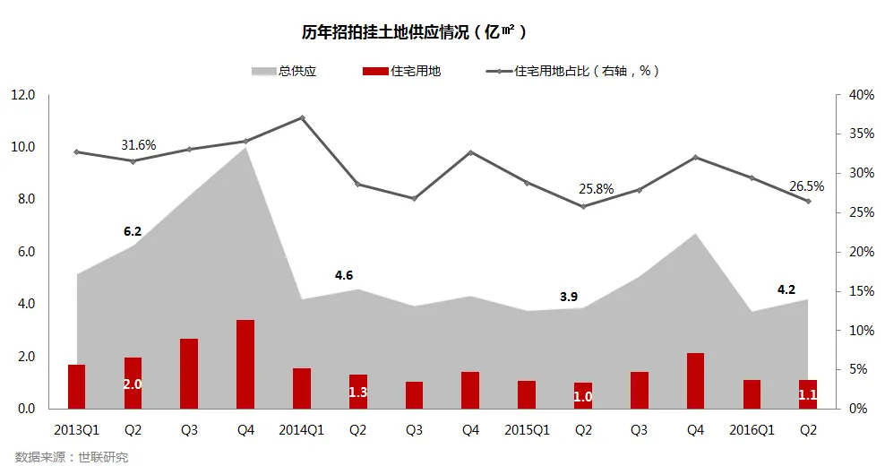 • 2016年二季度,全国招拍挂土地出让总面积4.2亿㎡,同比去年增加8.7%,其中住宅用地1.1亿㎡,占总出让面积26.5%
