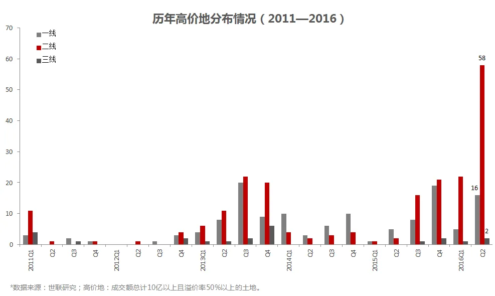 • 一、二线一直是高价地的主要发生区域,特别是二线城市;
