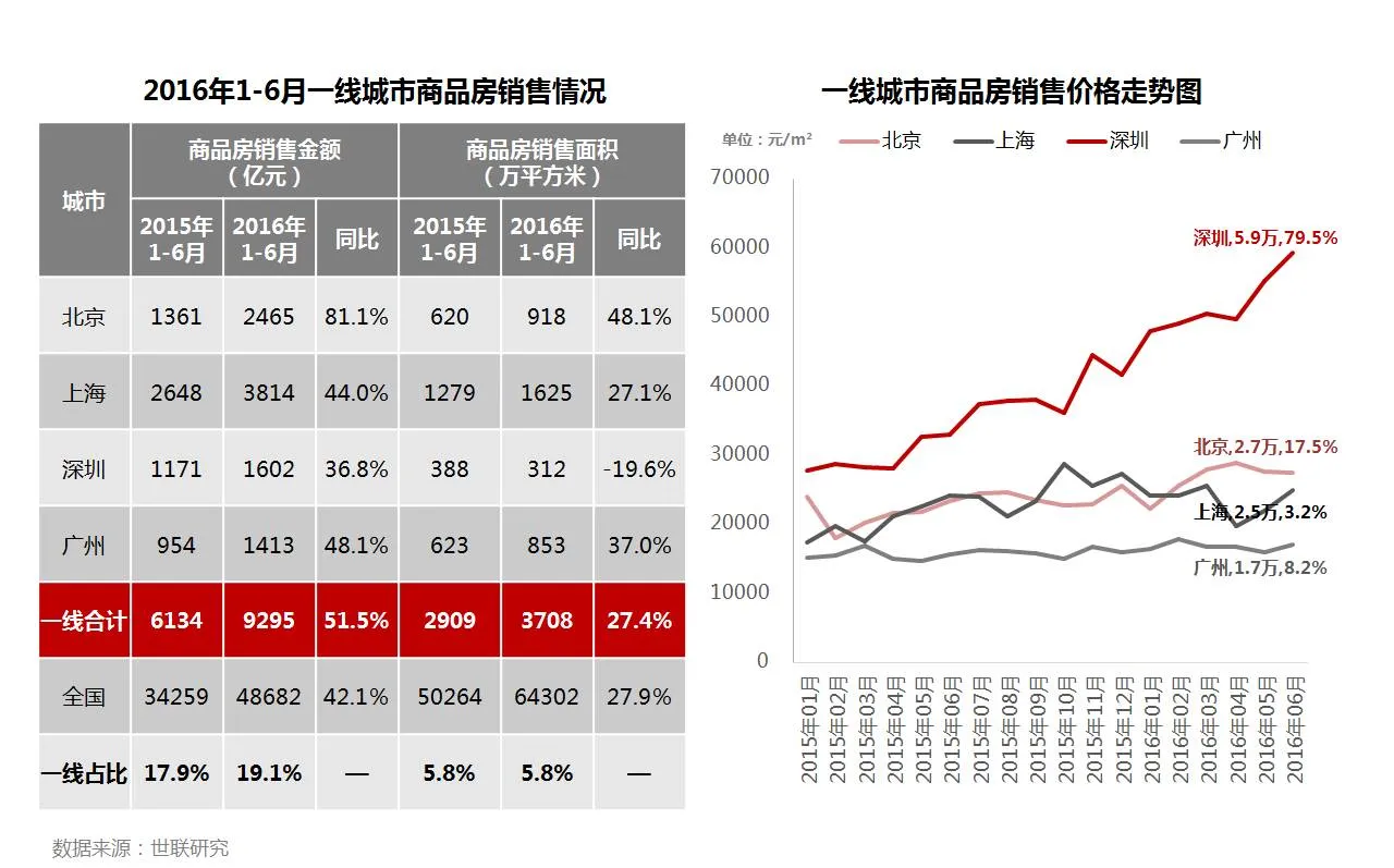 • 2016年1-6月,一线城市商品房销售总额9295亿元,同比增长51.5%,占全国销售总额的19.1%。